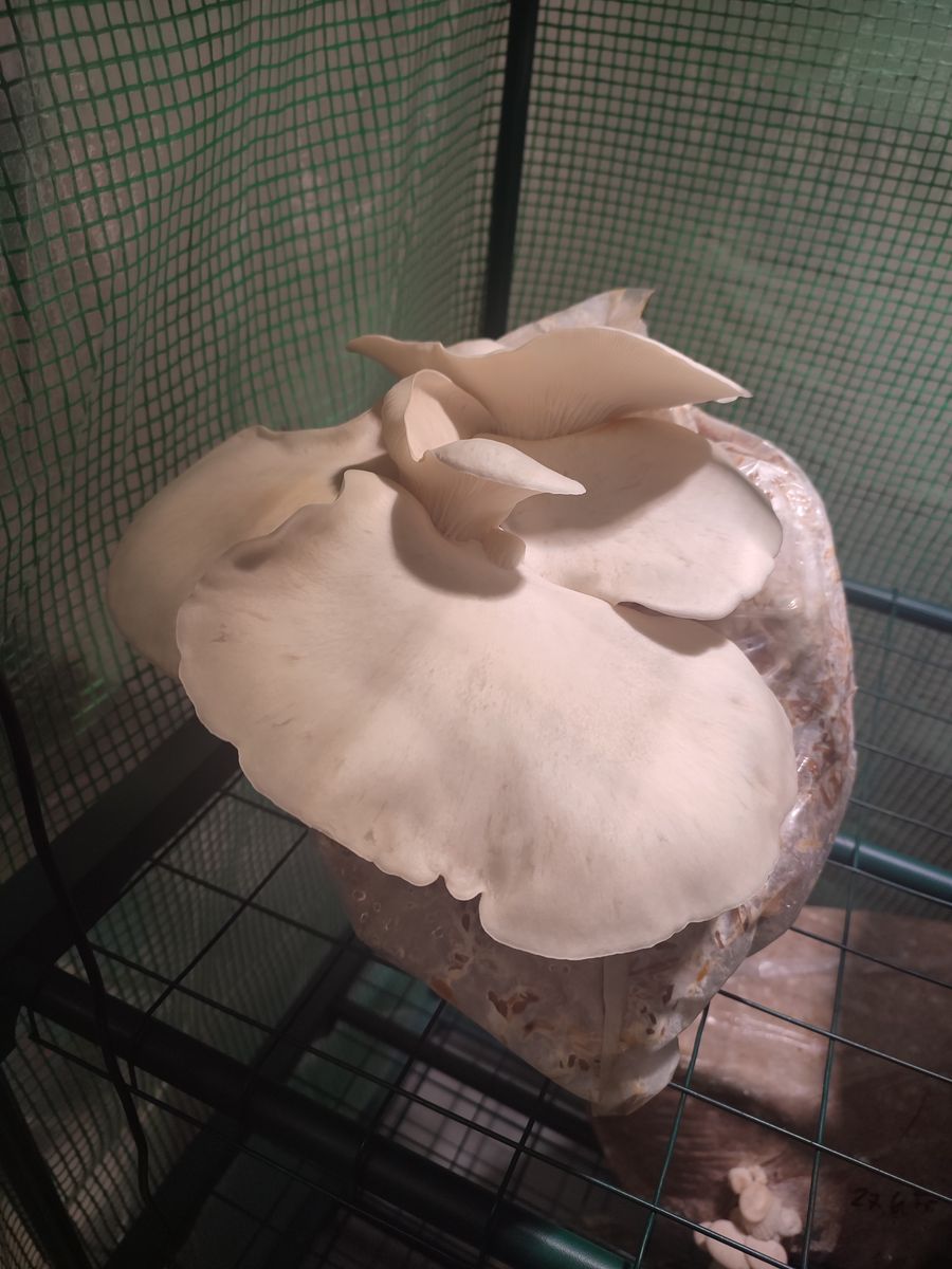 Nebenbei habe ich noch zwei mal 1 kg Hartholzpellets mit 1% Wasserstoffperoxidlösung rehydriert (bewusst viel zu starke Lösung verwendet, normalerweise sollte es 0,5% sein) und mit völlig überlagerter Piopinobrut beimpft. Das selbe mit völlig überlagerter Maitakekultur. Mal gucken was da passiert, die Brut zeigte schnelels Mycelwachstum, das Mycel scheint aber relativ langsam in das Substart rein zu wachsen, wahrscheinlich wegen dem hohen Anteil von Wasserstoffperoxid. Mit der Zeit verfliegt das allerdings und dann sollte das Mycel auch rein wachsen. Spannend zu sehen, ob es Kontis geben wird, oder nicht.