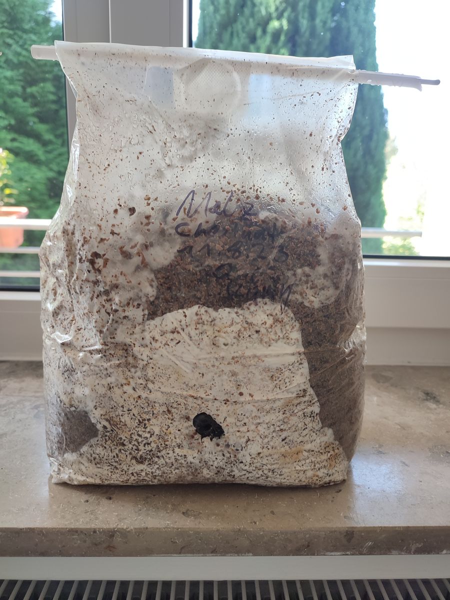 Demnächst kommt ein Amerikanischer Stachelbart hinzu, der jetzt schon beim Durchwachsen Fruchtungsansätze zeigt (das ist typisch für Stachelbärte), da bin ich also guter Dinge das der gleich loslegt, sobald im Fruchtungszelt. Der Chestnut Block ist nun auch zu 95% besiedelt, die letzten % dauern noche twas, dann komtm der auch rein ins Zelt. Der sollte eigentlich auch fix loslegen.