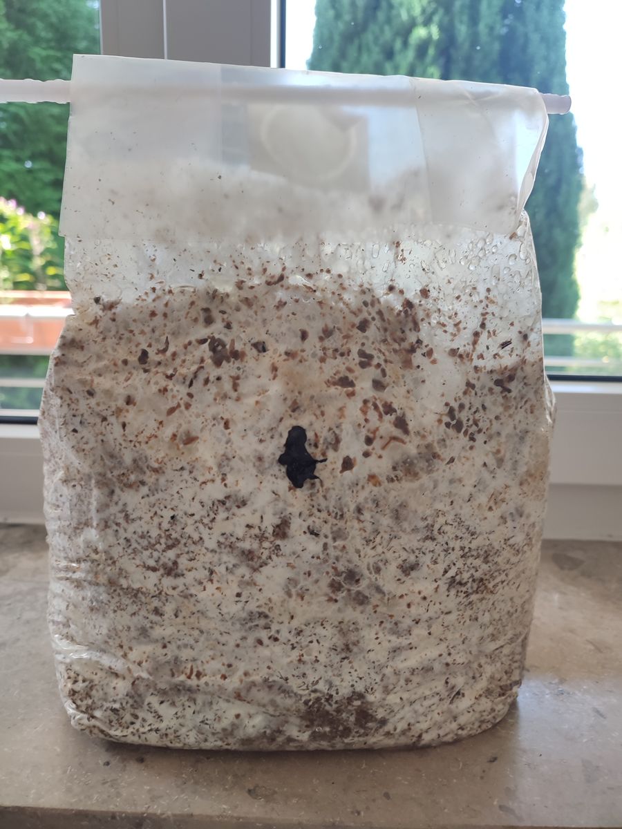 Die Maitakebeutel wachsen extrem schnell zu, die Piopinobeutel etwas langsamer und der oben fotografierte Chestnutbeutel wuchert auch vernünftig weiter. Der gesellt sich dann ggf. am WE oder Anfang nächster Woche mit ins Fruchtungszelt.