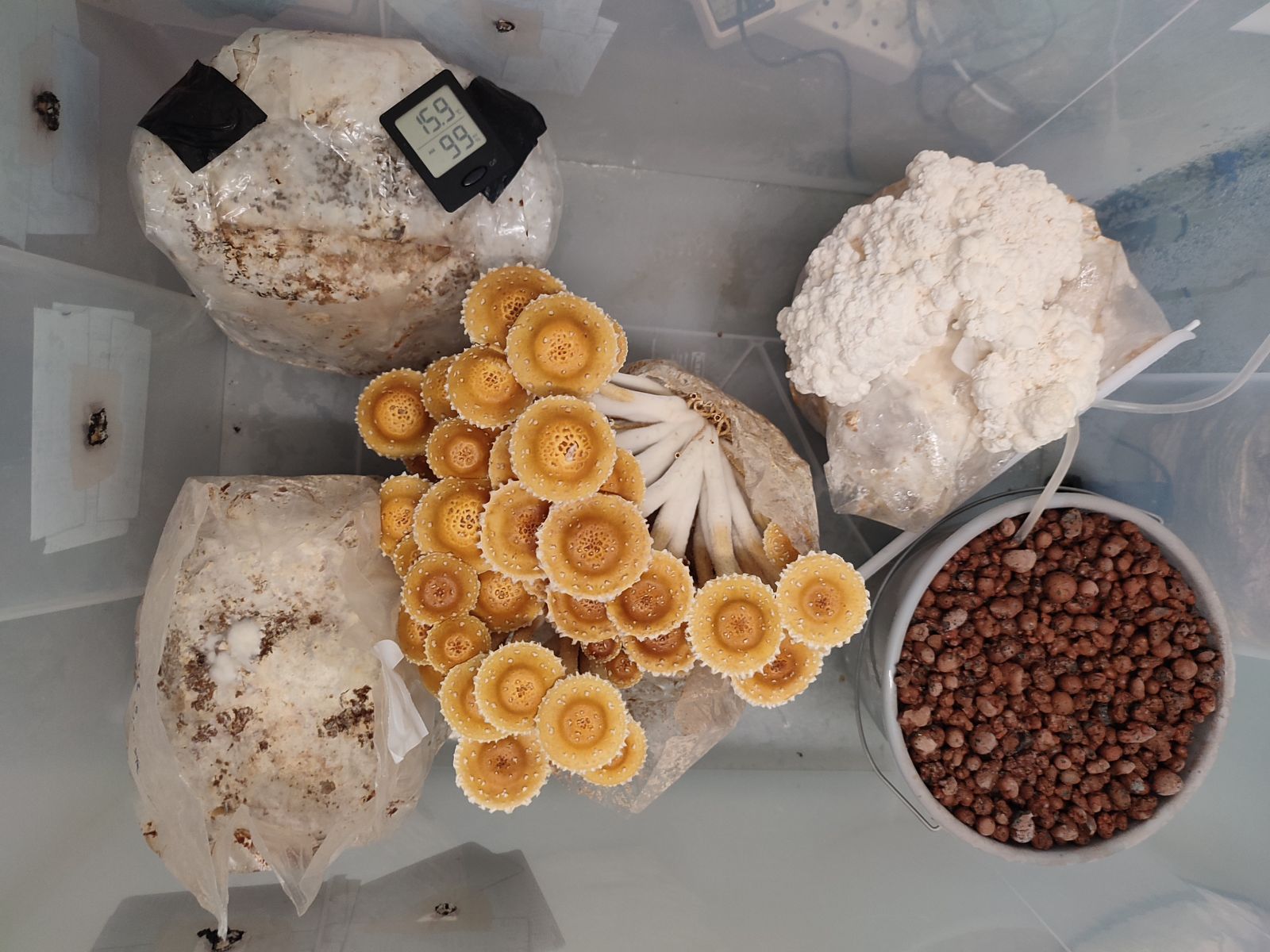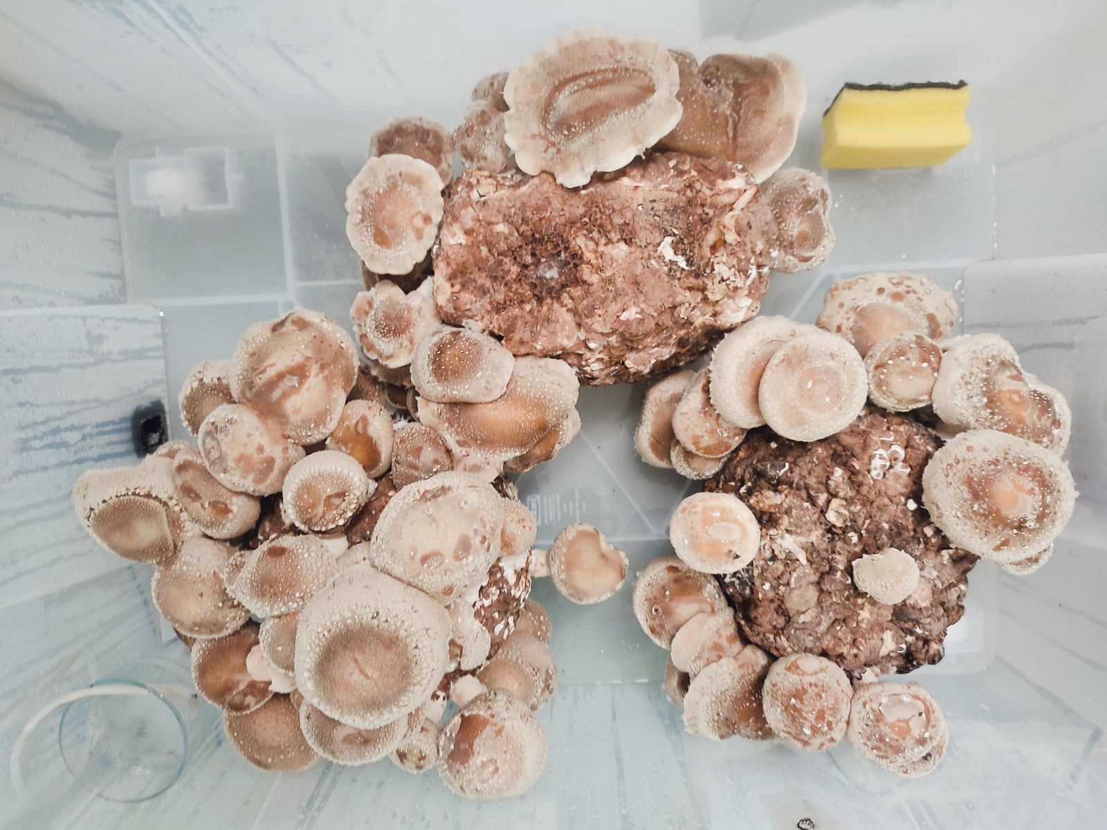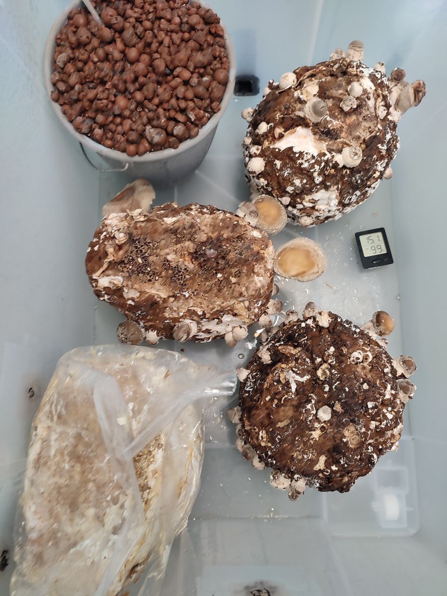 Nu ist die Box mit 3 Shiitake Blöcken und einem Maitake Block belegt. Der Maitake hatte schon komplett im Beutel gefruchtet, aus Zeitgründen und Platzmangel konnte ich ihn allerdings nicht freilegen und somit ist die Fruchtung verkümmert. Ich habe die obere Schicht des Substats einfach abgeschnitten und ihn zu den Shiitake gestellt. Mal gucken ob das noch was wird. Ich werde am WE wahrscheinlich einen neuen Block Maitake und einen neuen Block Shiitake herstellen, damit es im Fluss bleibt. Shiitake dauert ca. 2 Monate bis zur Reife. Der jetzige Strain (Klon vom Supermarktshiitake) scheint schon sehr früh zu fruchten. Ich werde mal versuchen den manuell früher in die Fruchtung zu schicken, bevor er mir von selbst im Beutel fruchtet. Evtl. bringt das ja bessere Ergebnisee.