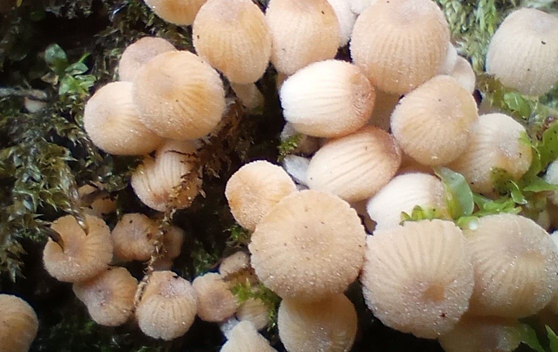 10. Großpilze? Gesäter Tintling (Coprinellus disseminatus) am Fuße einer Birke