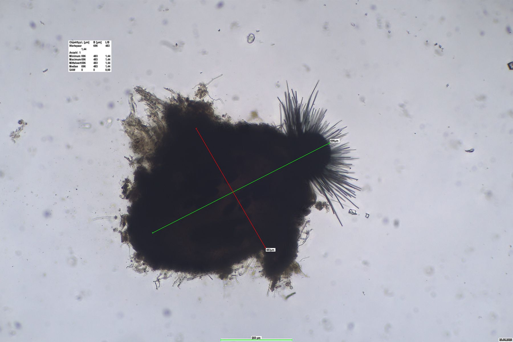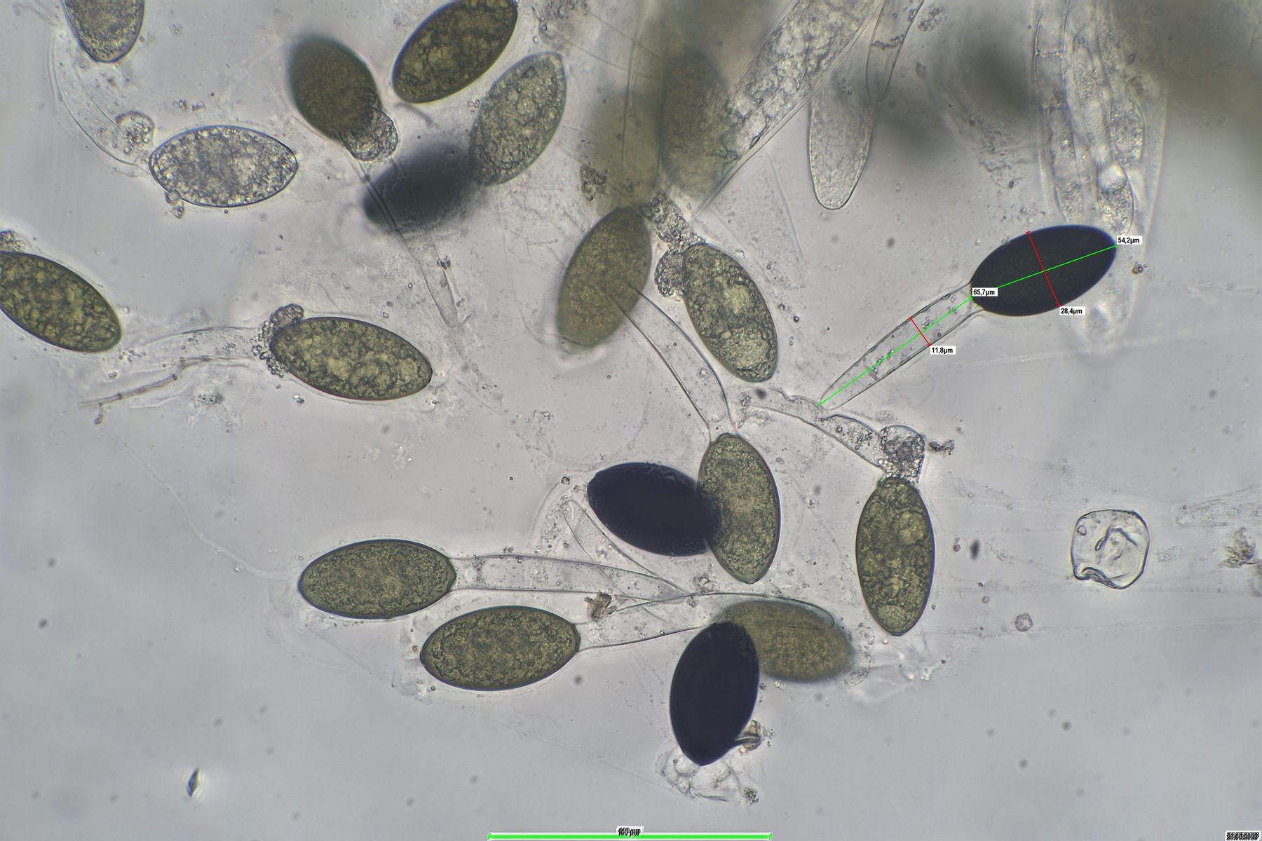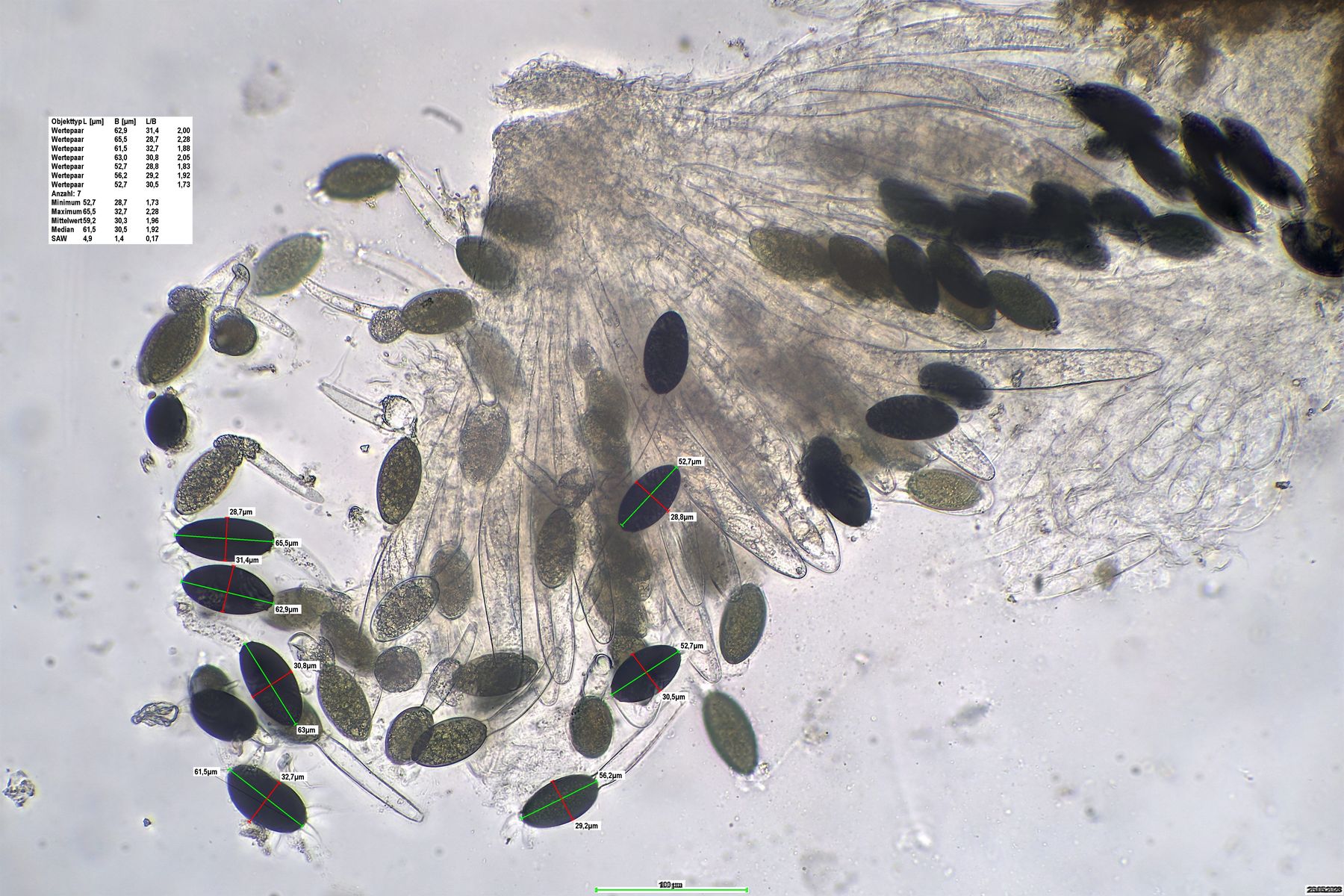 Sporen:(48) 52-65 (67) x 28-33 , Pedicel: bis 80 x 12 , Caudae : schwierig zu sehen
