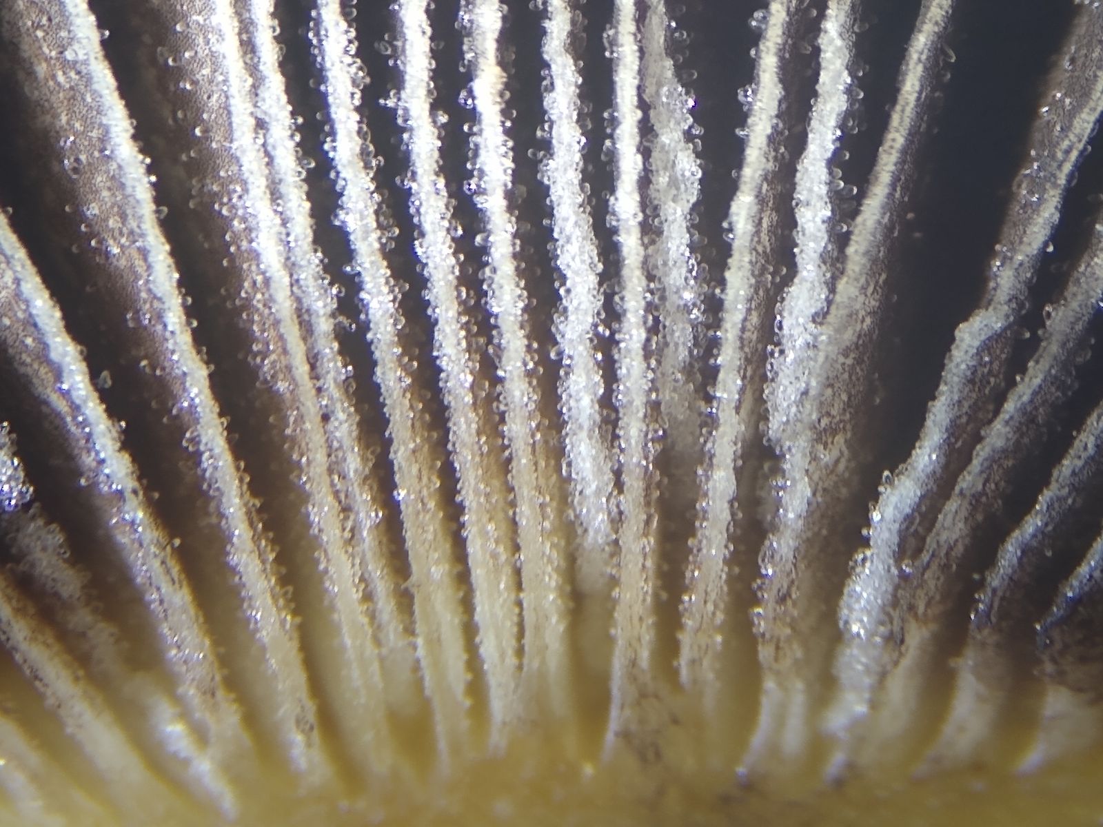 Blick von Hutoberseite (Huthaut abgezogen) auf Lamellenwände mit Pleurozystiden