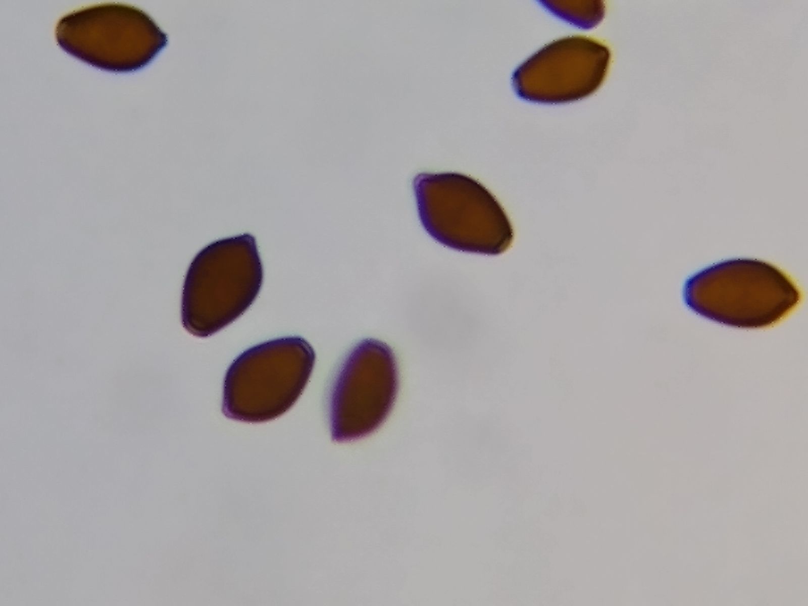 Bild 9 Sporen aus Sporenabwurf; die Sporen haben angedeutet Mitraform (vielleicht eher rhombisch?) und einen großen Keimporus (und ev. 2. kleinem Keimporus gegenüber an der Spitze?)