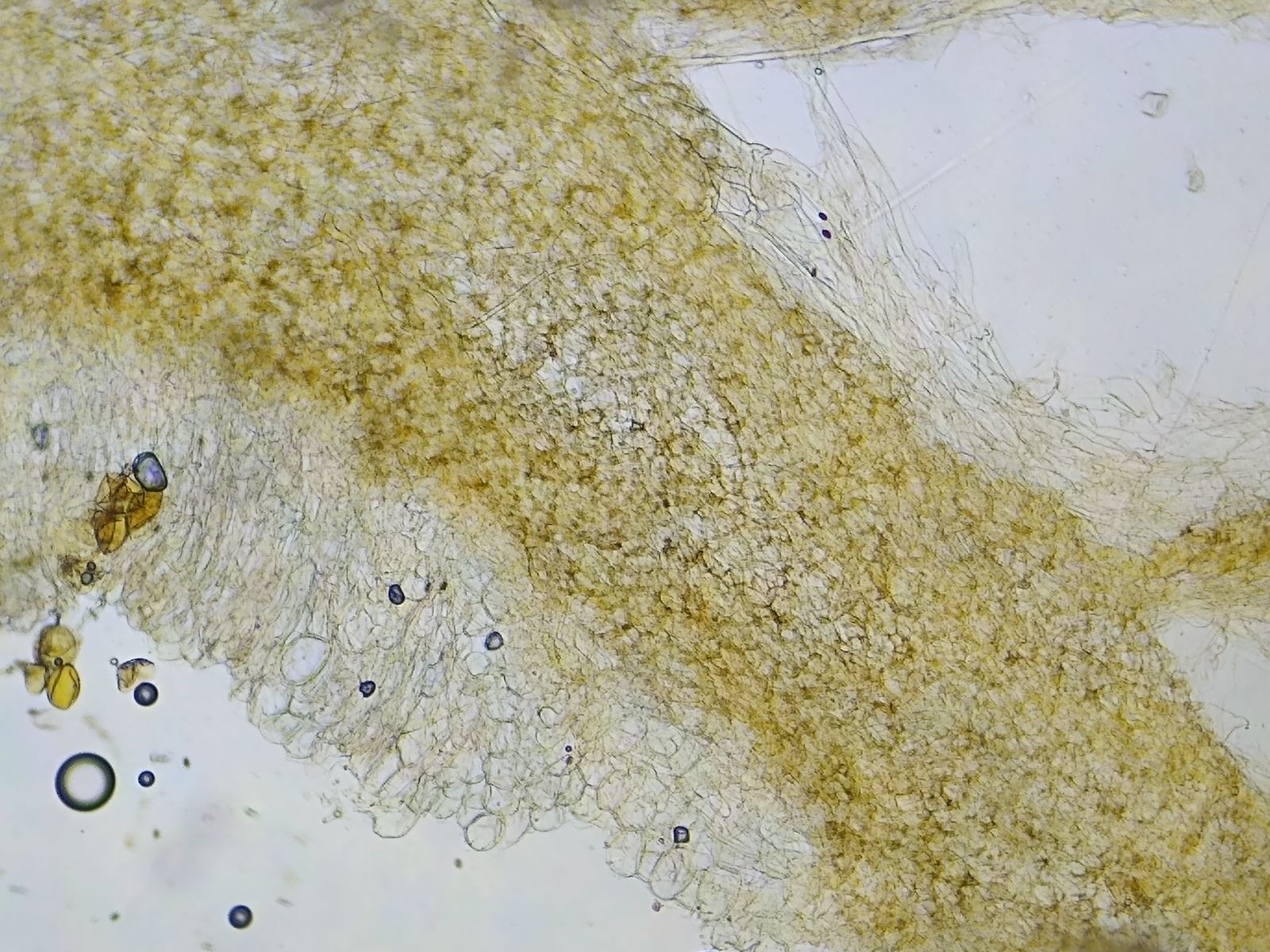 Bild 15 gequetschte Huthaut mit kugelförmigen und gestreckten Zellen, gelb pigmentiert