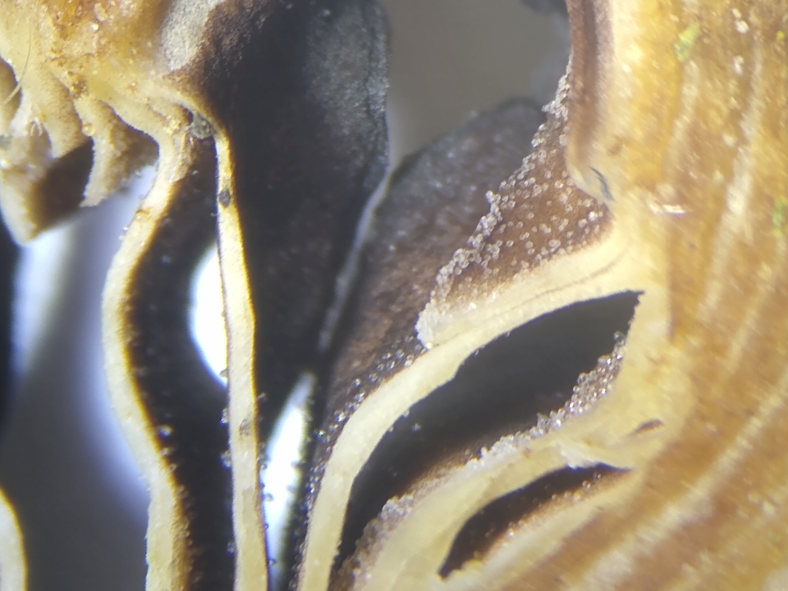 Bild 7 Blick zwischen die Lamellen mit Pleuroystiden; Lamellen sind nicht zerfließend