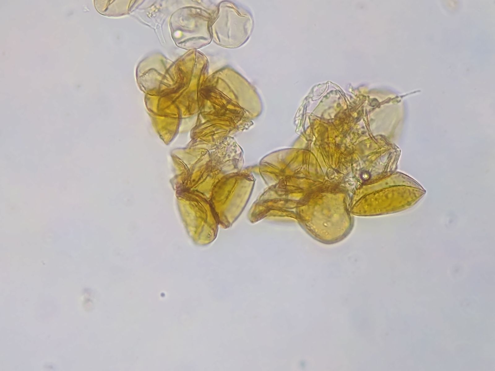 - gelbe Velumreste auf Huthaut (?) = runde flache Zellen in Klumpen
