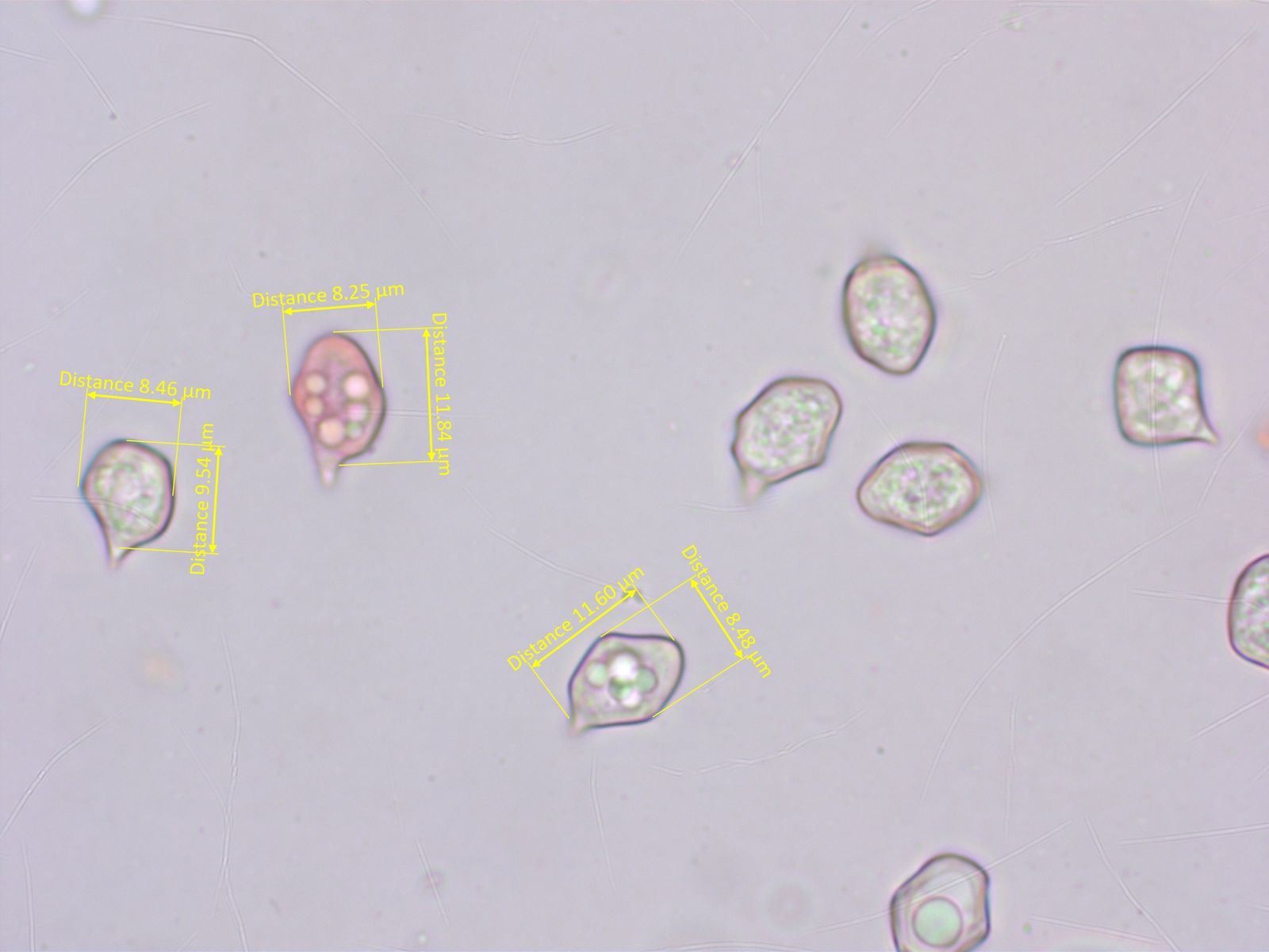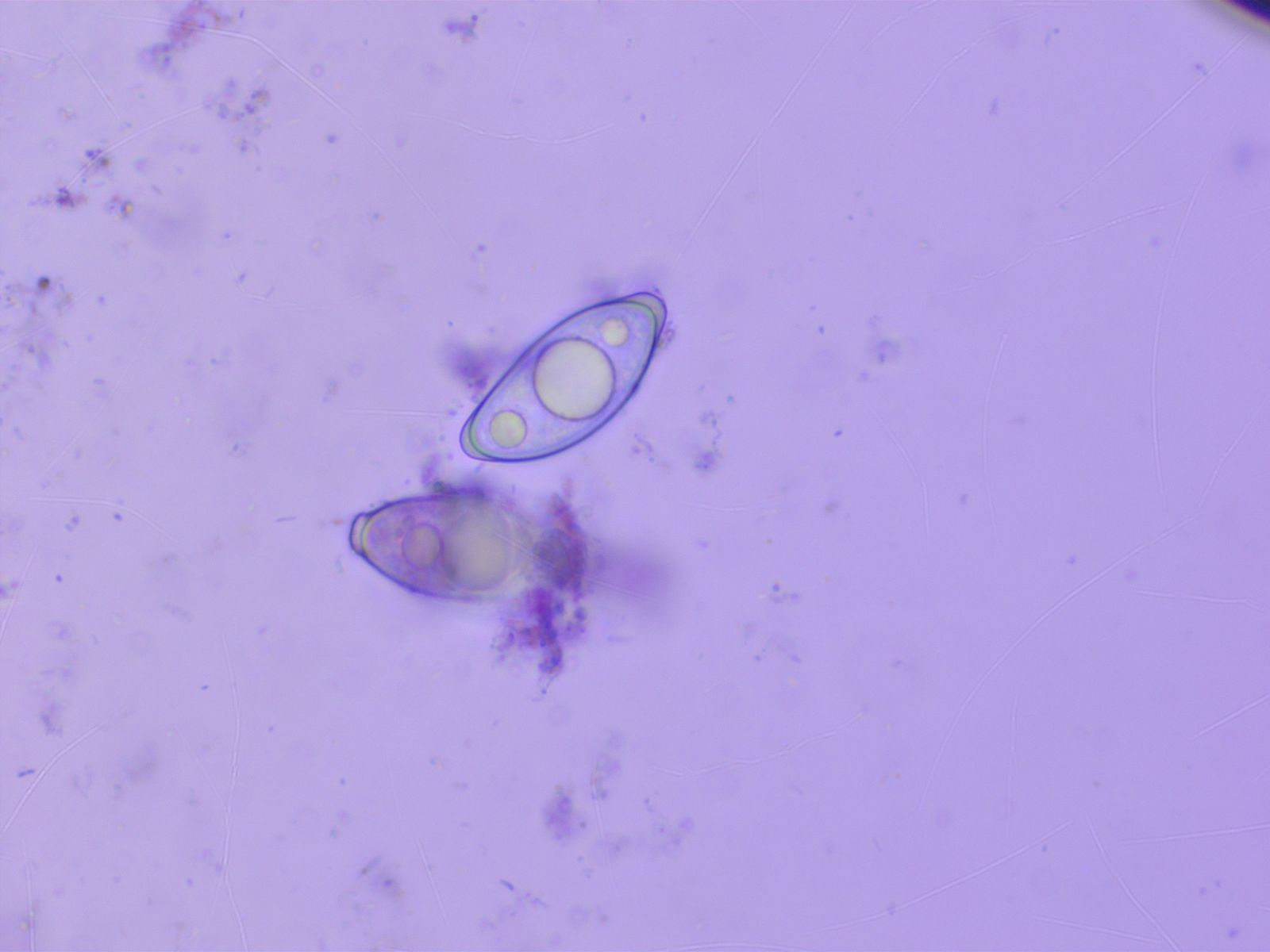 Wie man an dem einen Fruchtkörper schon vermuten kann, war er reif. Die Sporen zeigen die typischen Wölbungen an den Enden.
