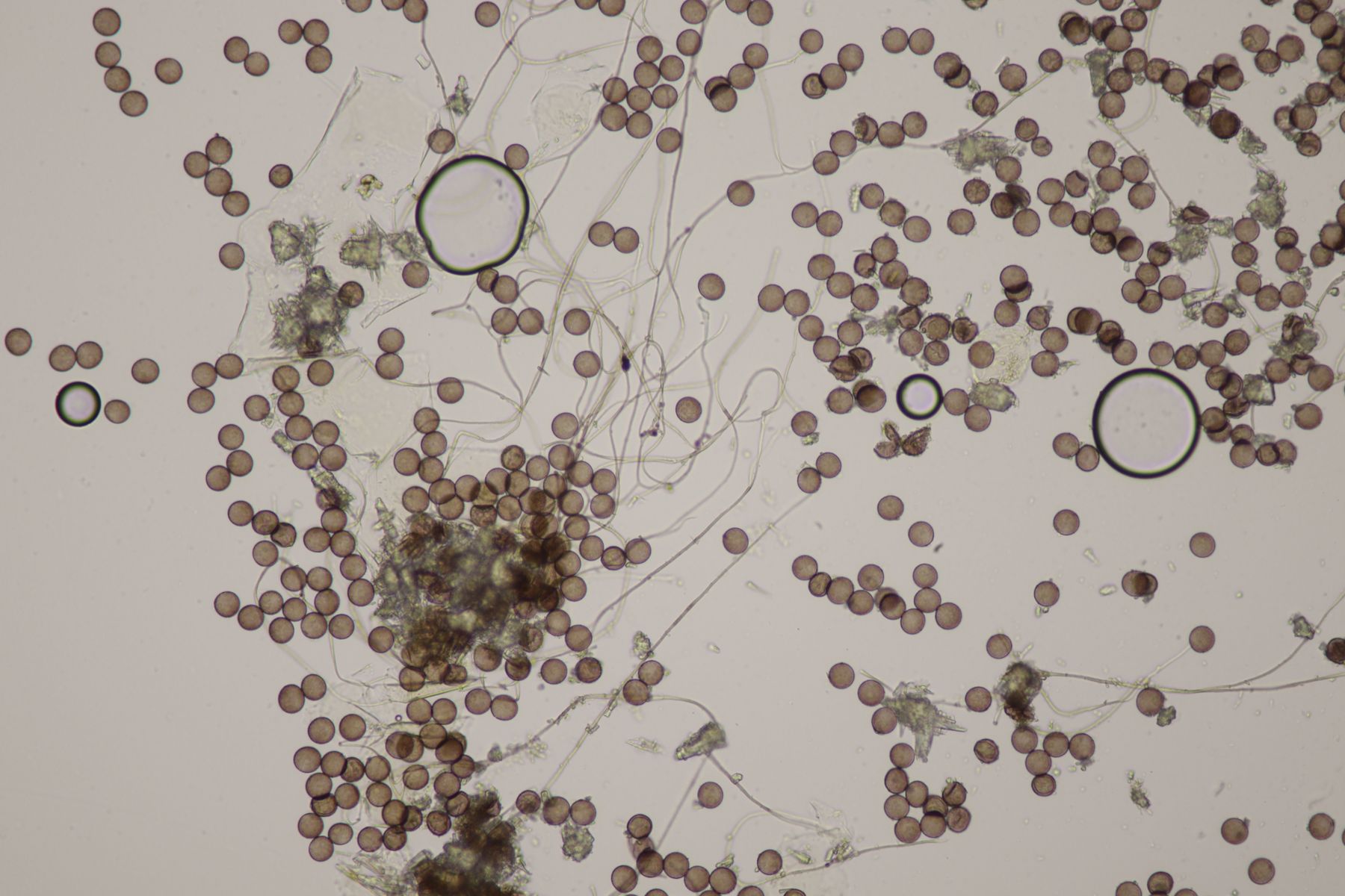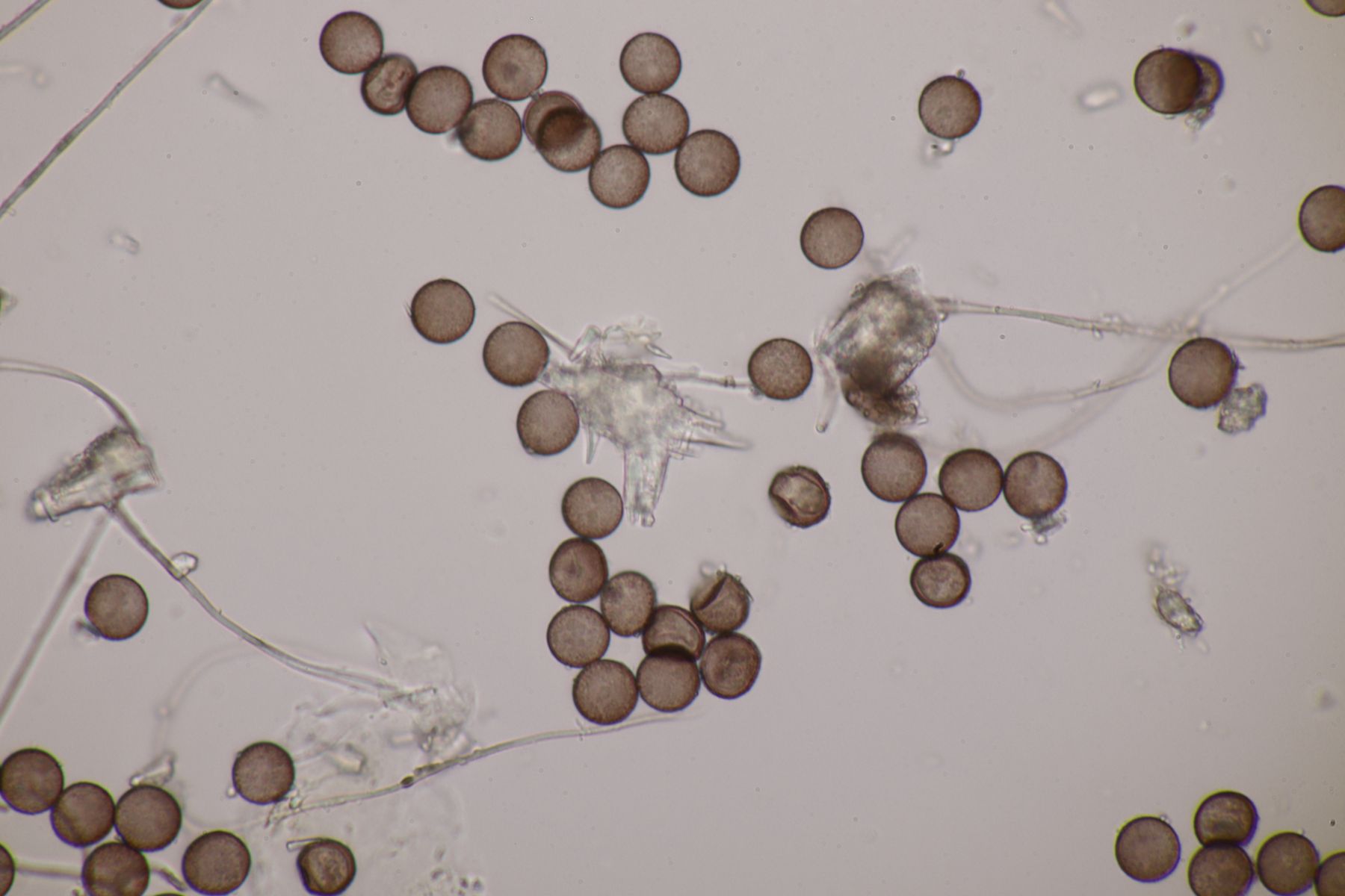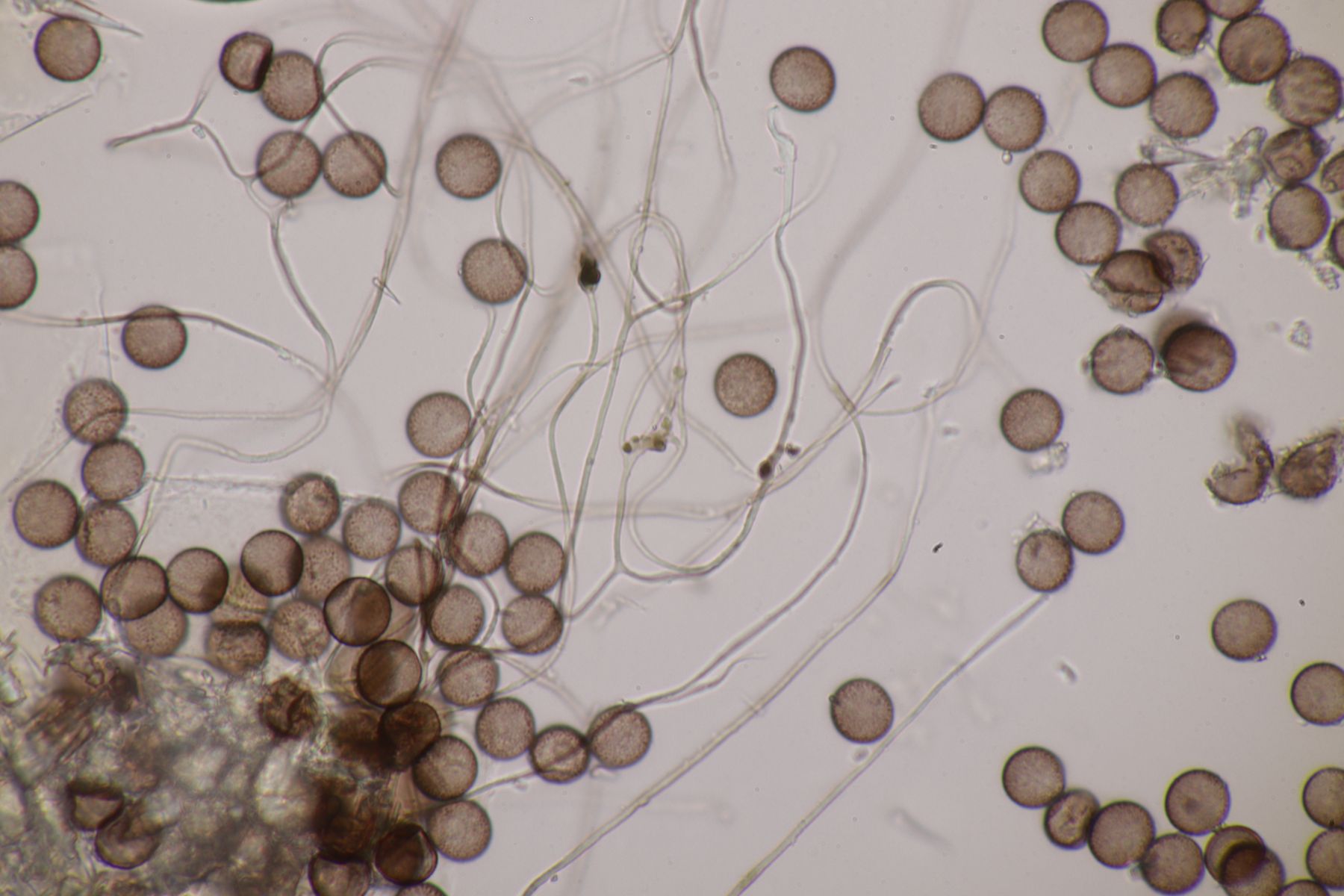 nachdem hier im Forum vor längerer Zeit ja schon von den beiden Didymium-Arten auf Pestwurzblättern berichtet wurde, konnte ich am letzten Sonntag in Winterberg selber welche finden. Leider bin ich mir nicht ganz sicher, welche der beiden Arten ich hier vor mir habe. Die dunkle Farbe spricht eher für D. tussilaginis, könnte aber auch ein Artefakt sein, weil die Peridie bei den meisten Fruchtkörper schon ziemlich abgewetzt ist und man nur noch Sporenmasse sieht. Sporenmaße von 10.1-11.7 µm passen eher zu D. vernum, auch wenn sie da wohl eher einen Hauch zu groß sind. Schließlich fällt noch das relativ locker verteilte Wachstum auf, das sich auch eher auf den Rand des Blattes beschränkt. Laut Literatur auch ein Hinweis auf D. vernum. Was sagen die Expert:innen dazu?