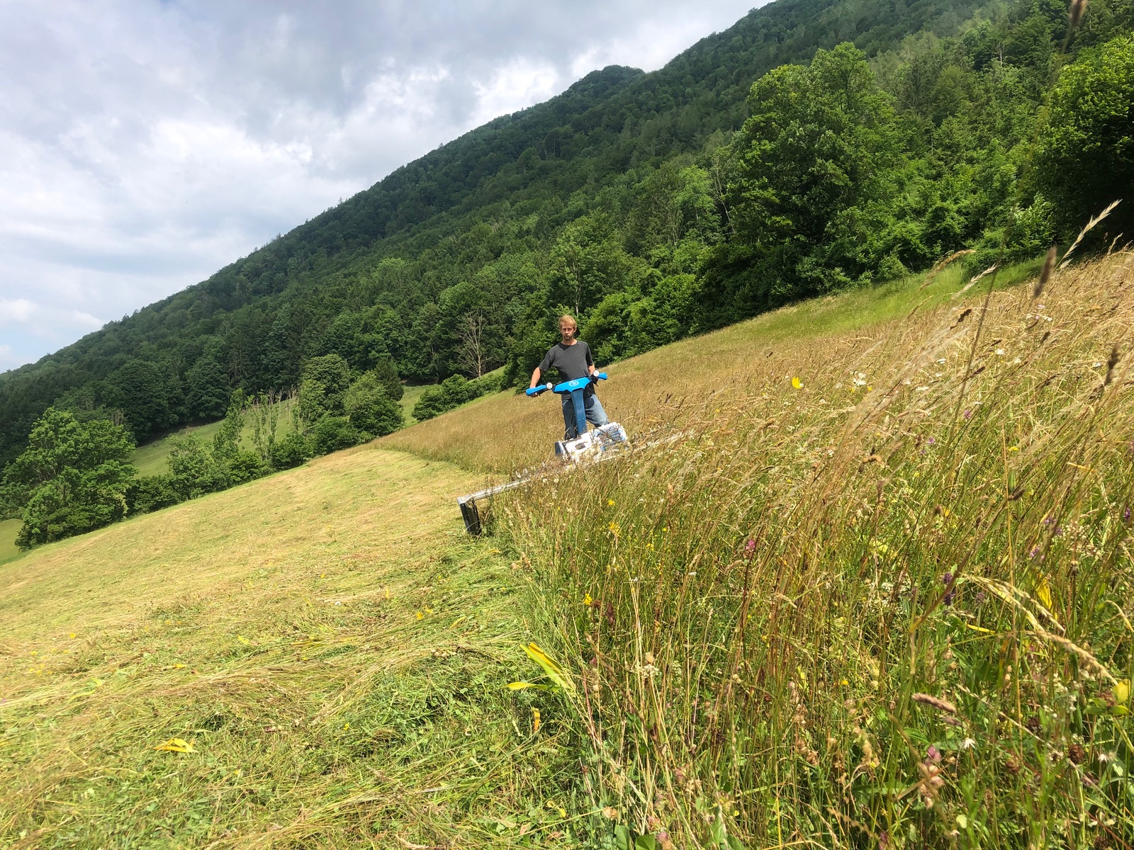 Seit dieser Saison haben wir auch einen neuen Mäher im Einsatz, der nicht nur extrem geländegängig ist, sondern in flachen Flächen durch Selbstfahrfunktion, 2,60m Balkenbreite und Mähgeschwindigkeiten von über 10km/h auch extrem schlagkräftig ist. Bei passendem Gelände kann hierdurch eine Flächenleistung von etwa 1,5ha/h erreicht werden.