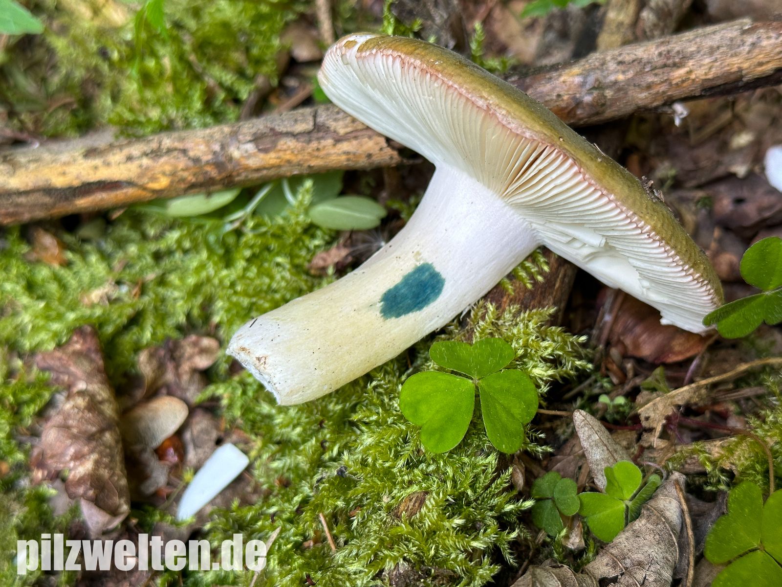 Der Stiel, teilweise auch bei jungen Fruchtkörpern, von der Stielbasis aus leicht weißbräunlich mit grünstich verfärbt:
