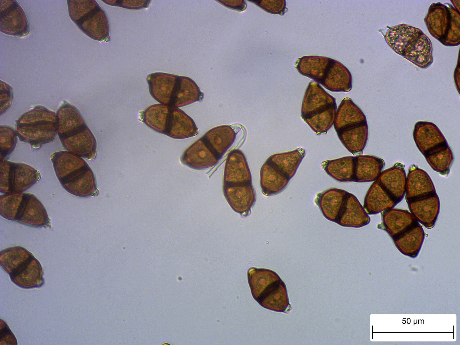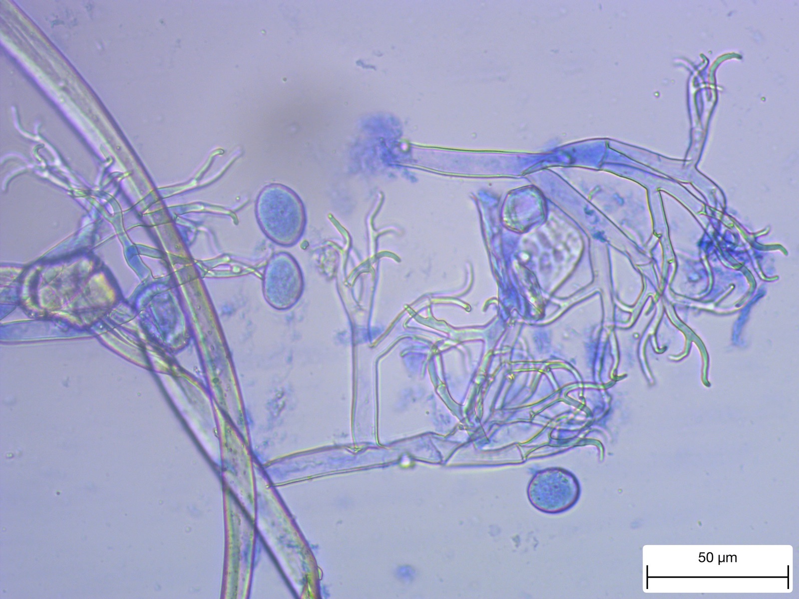 Ein paar mehrfach septierte Sporen waren unterm Mikroskop erkennbar, aber mit jener wunderschönen Nacktbasidie haben die wohl keine Ähnlichkeit. Was denkst du über diesen spektakulären Fund, boccaccio?