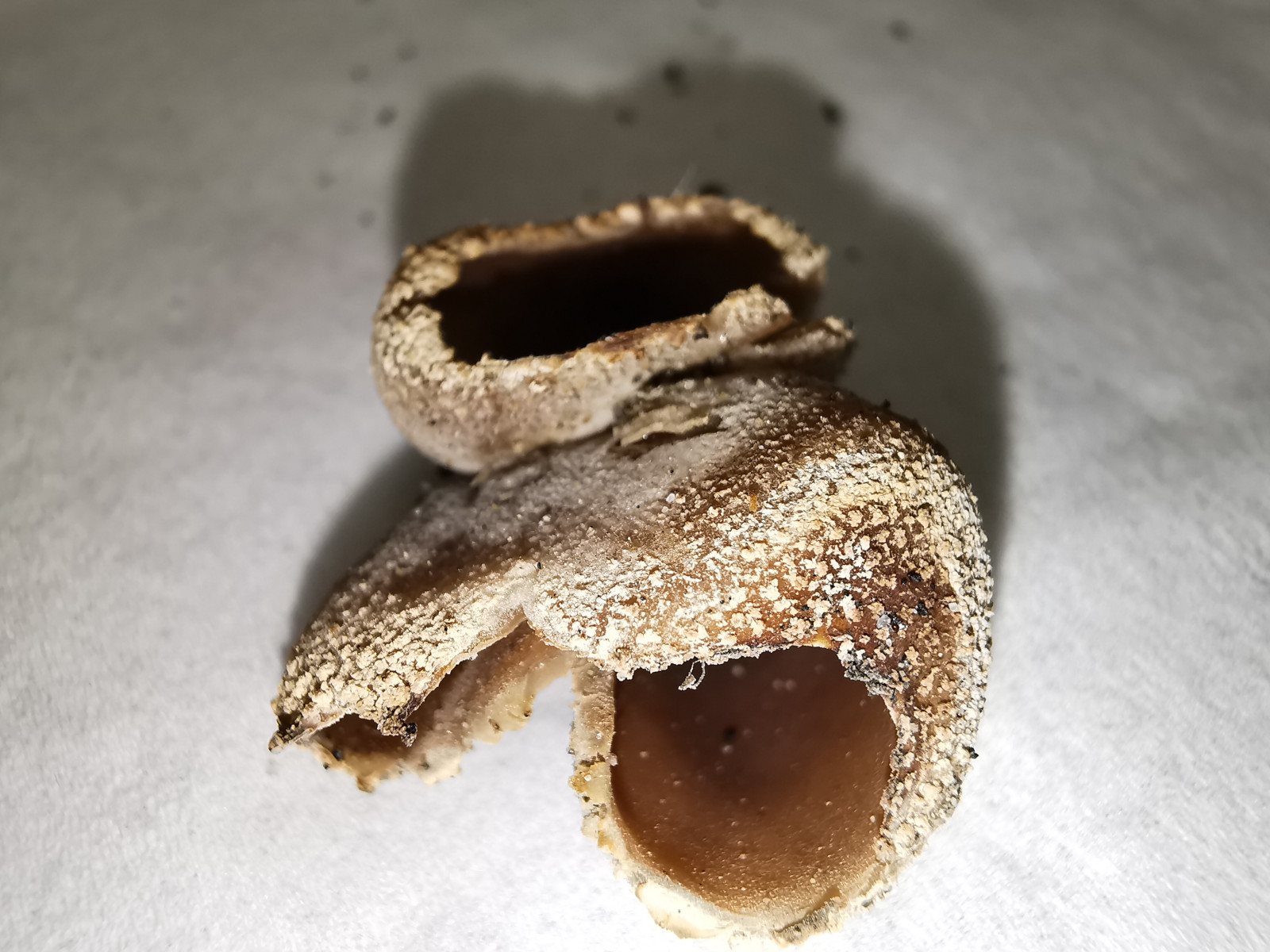 Ach ja, zuerst dachte ich, dass es vielleicht auch ein Öhrling sein könnte. Ich habe aber nochmal alle Bilder durchgesehen und soweit ich das sehe, war auf den ersten Bildern der Rand durchgehend und der zu sehende Schlitz ist vermutlich bei der Entnahme des FK entstanden. Daher denke ich, dass es ein Becherling ist.
