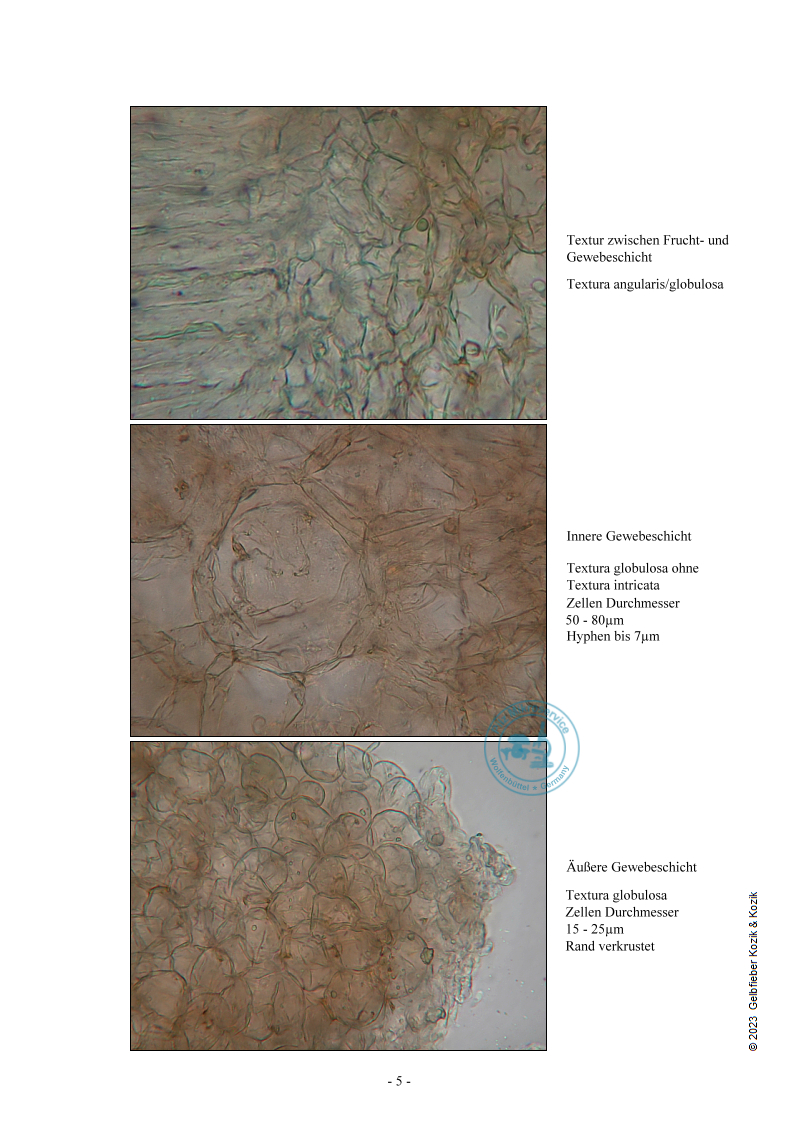 Äußere Gewebeschicht Textura globulosa, Zellen 15 – 25µm. Diese Zellen werden abschließend von einer Verkrustung umgeben.