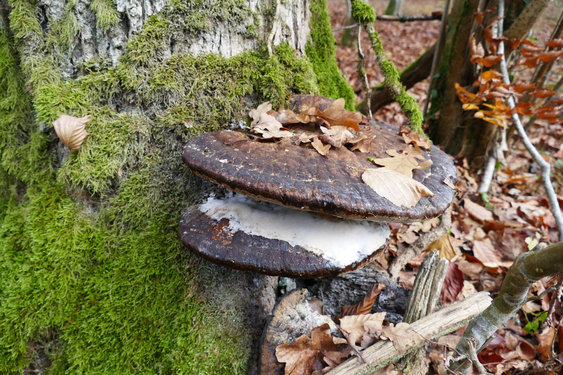 ich finde den auch faszinierend, sieht fast aus, wie diese Baiserschicht, die man manchmal auf Rhabarberkuchen findet. Eiche ist der typische Wirt für den Tropfenden Schillerporling.
