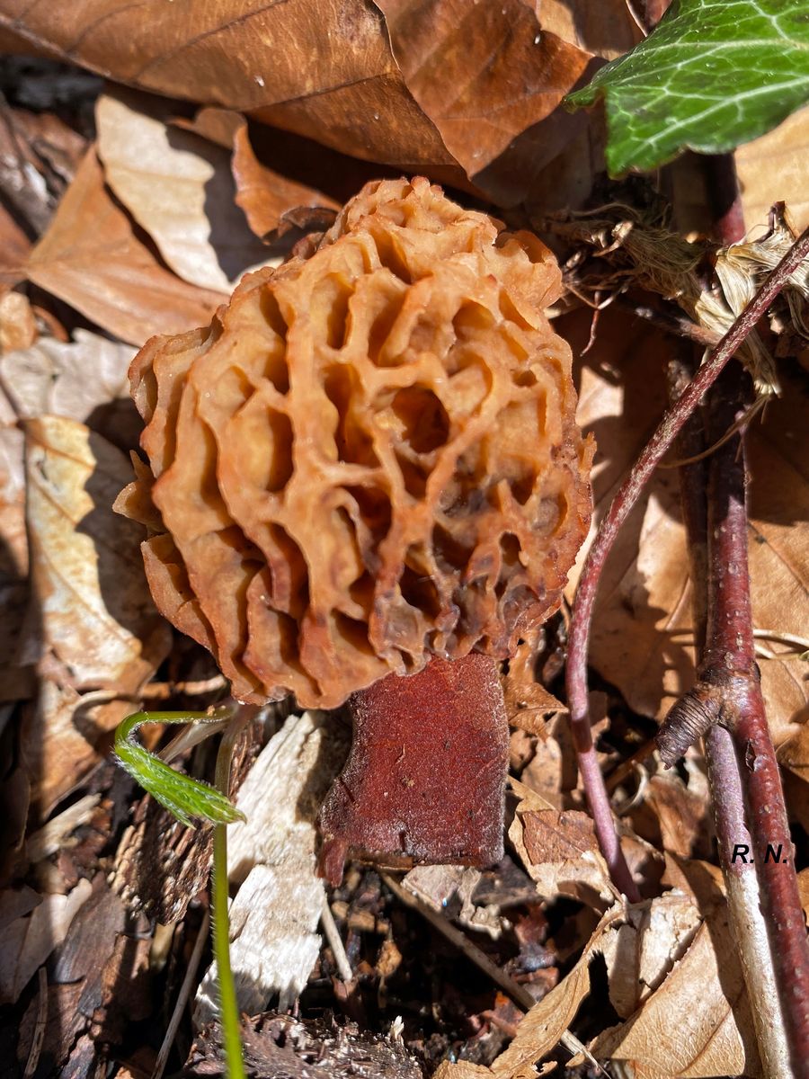 Nun habe ich aktuell noch eine Fundmeldung von Regina, die auch ab und an in der APV aktiv ist. Sie berichtete von einer Morchel mit sehr starker Rötung am Stiel, wir tauschten uns aus und sie stellte mir dankenswerter Weise folgende Bilder zur Verfügung: