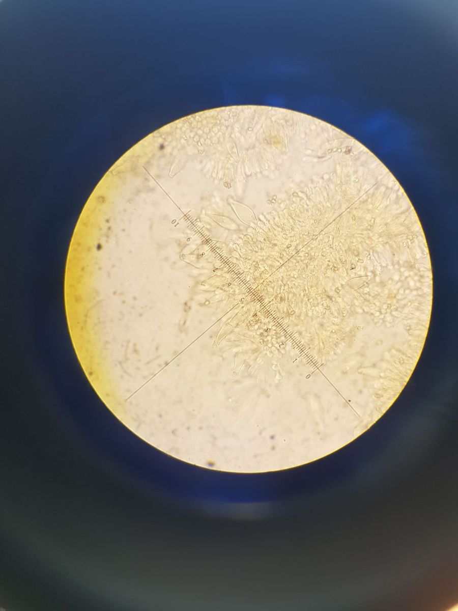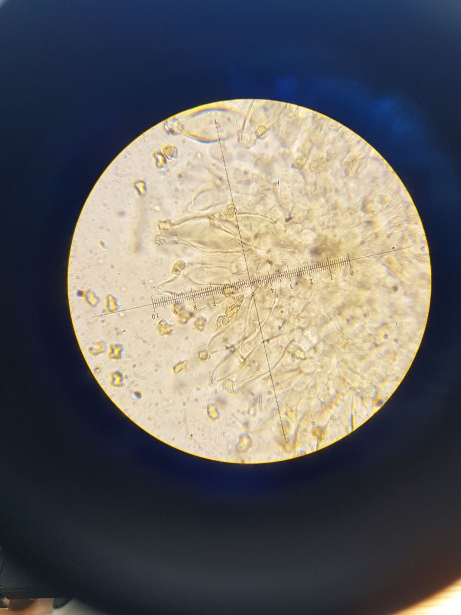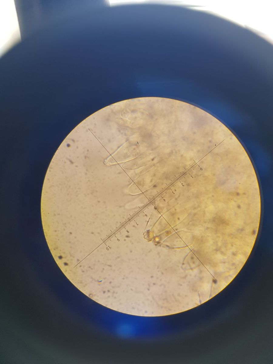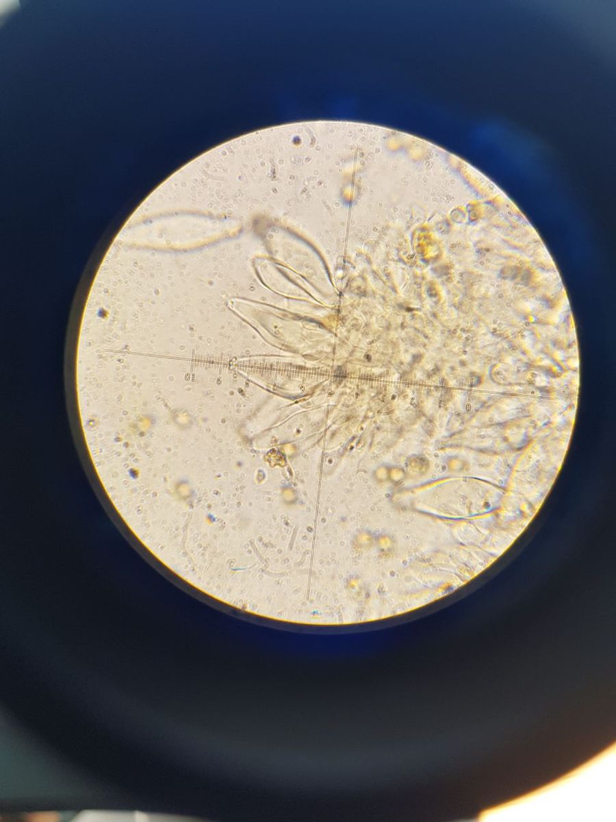 So und jetzt zu den Kaulozystiden, hier jetzt mal ein paar Fotos von einem dünnen mit der Pinzette abgezogenen Streifen. Ich sehe aber die Gefahr, dass da Hymenialzystiden drin sind oder auch Hyphenenden. Könnt ihr mir sagen ob das zumindest teilweise Kaulozystiden sind? Je nachdem was ihr sagt würde ich den Stiel dann mal genau von oben nach unten absuchen um zu schauen ob sie nur oben vorkommen.