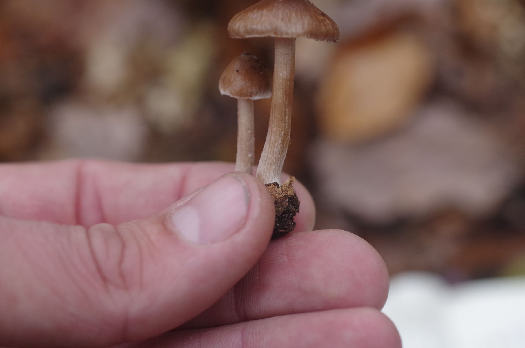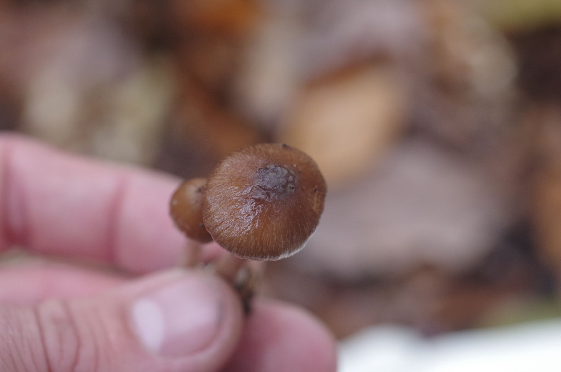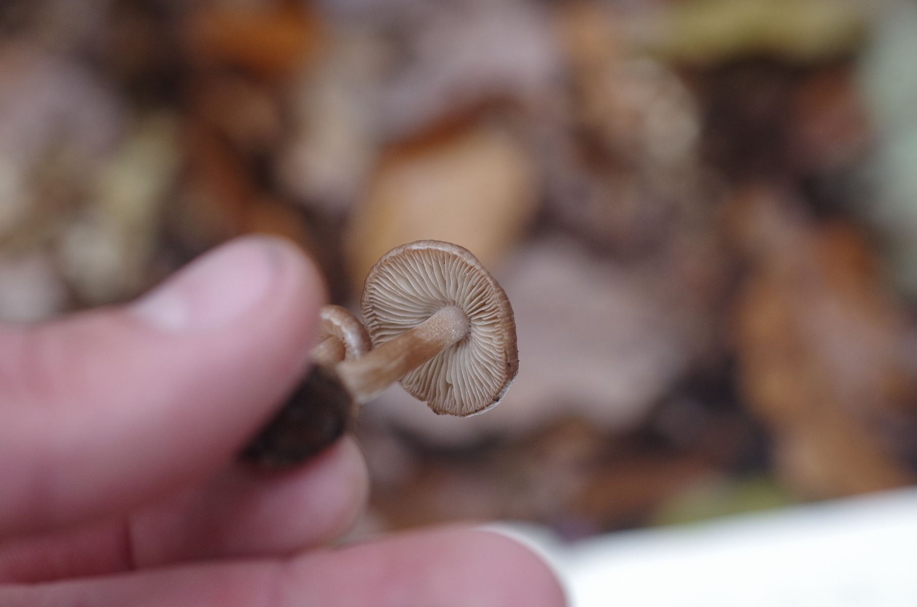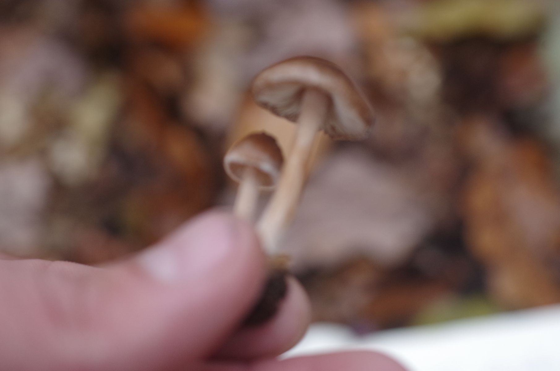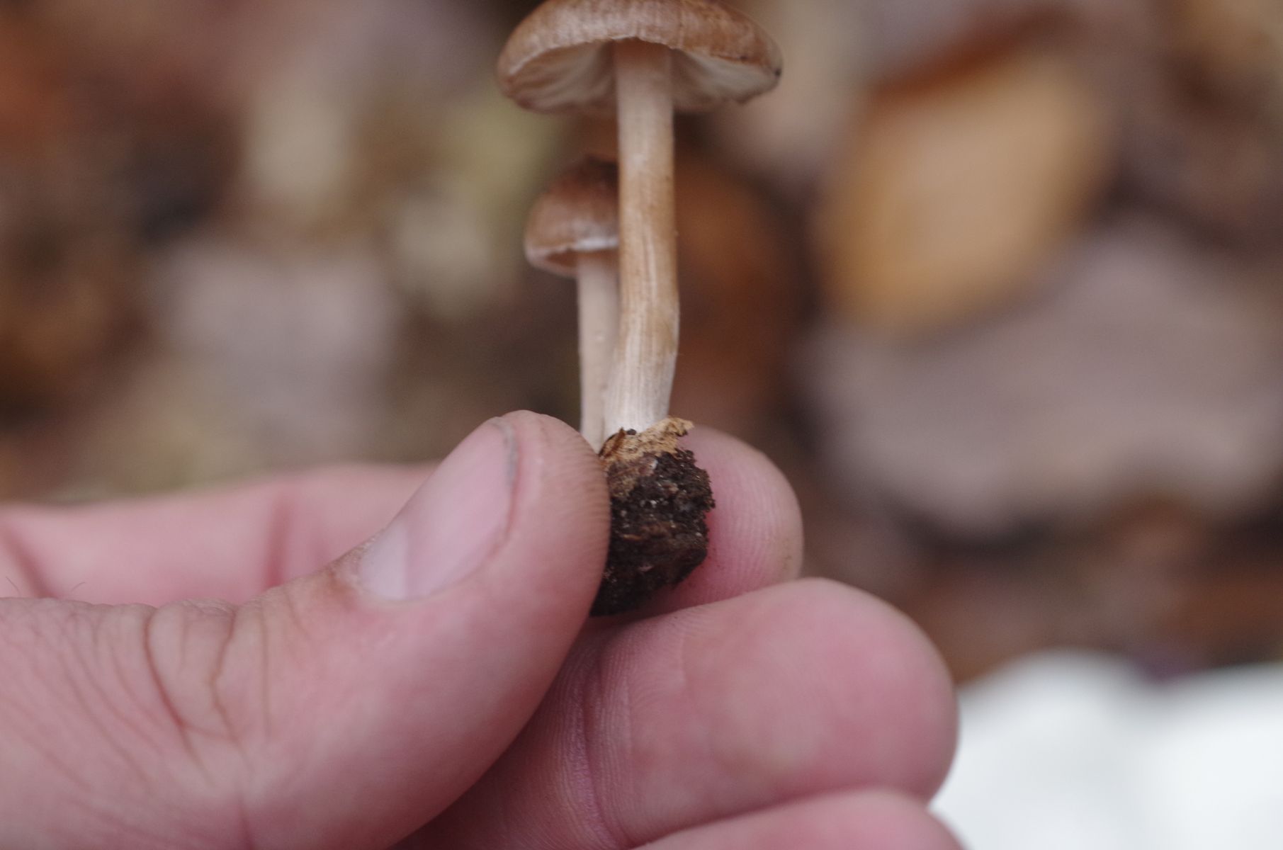 Makroskopisch: Mit verdickter Stielbasis. Die dunkle Stelle in der Mitte des Hutes ist vielleicht ein gutes Merkmal.