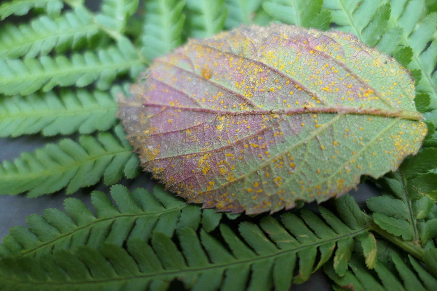 Brombeeren gibts auch im Garten, wenn auch unerwünschte. Auch ihre Blätter werden von Pilzen bewohnt. Wenn ich richtig liege, könnte dieser Rostpilz den Namen Kuehneola uredinis tragen.