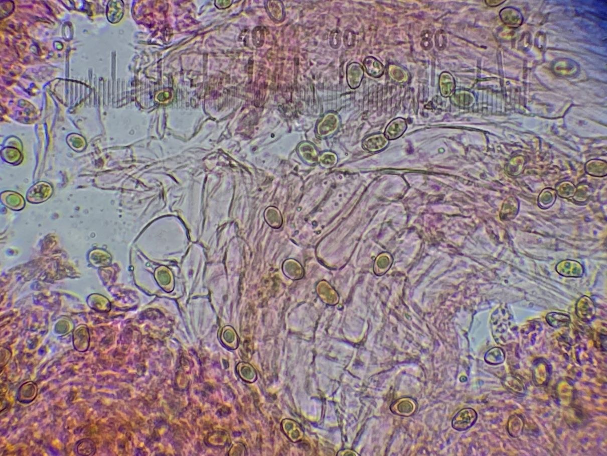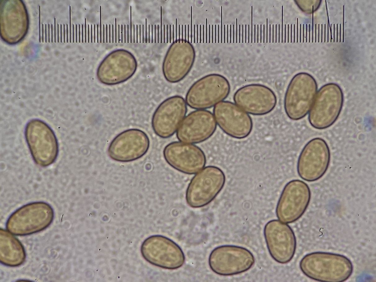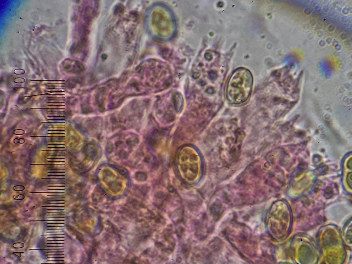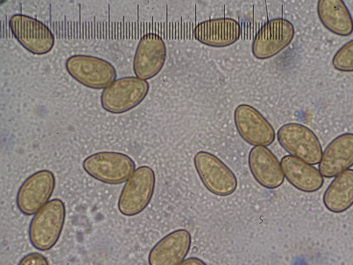die Sporengröße ging tatsächlich bis ca. 10, 5 µm. Ich habe auch noch weitere Fotos. Z.B. seltsam gekammerte Sporen. Aber diese Fotos werden vermutlich auch nicht weiter helfen bei dem seltenen Pilz.