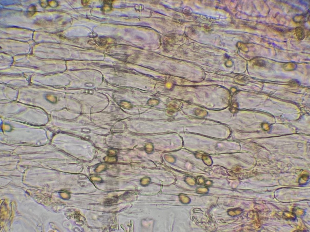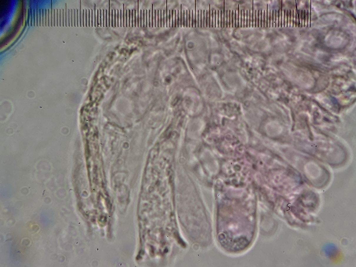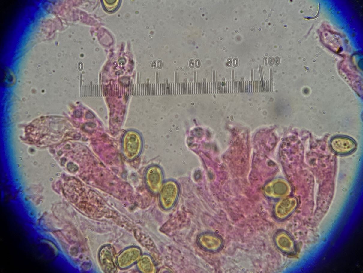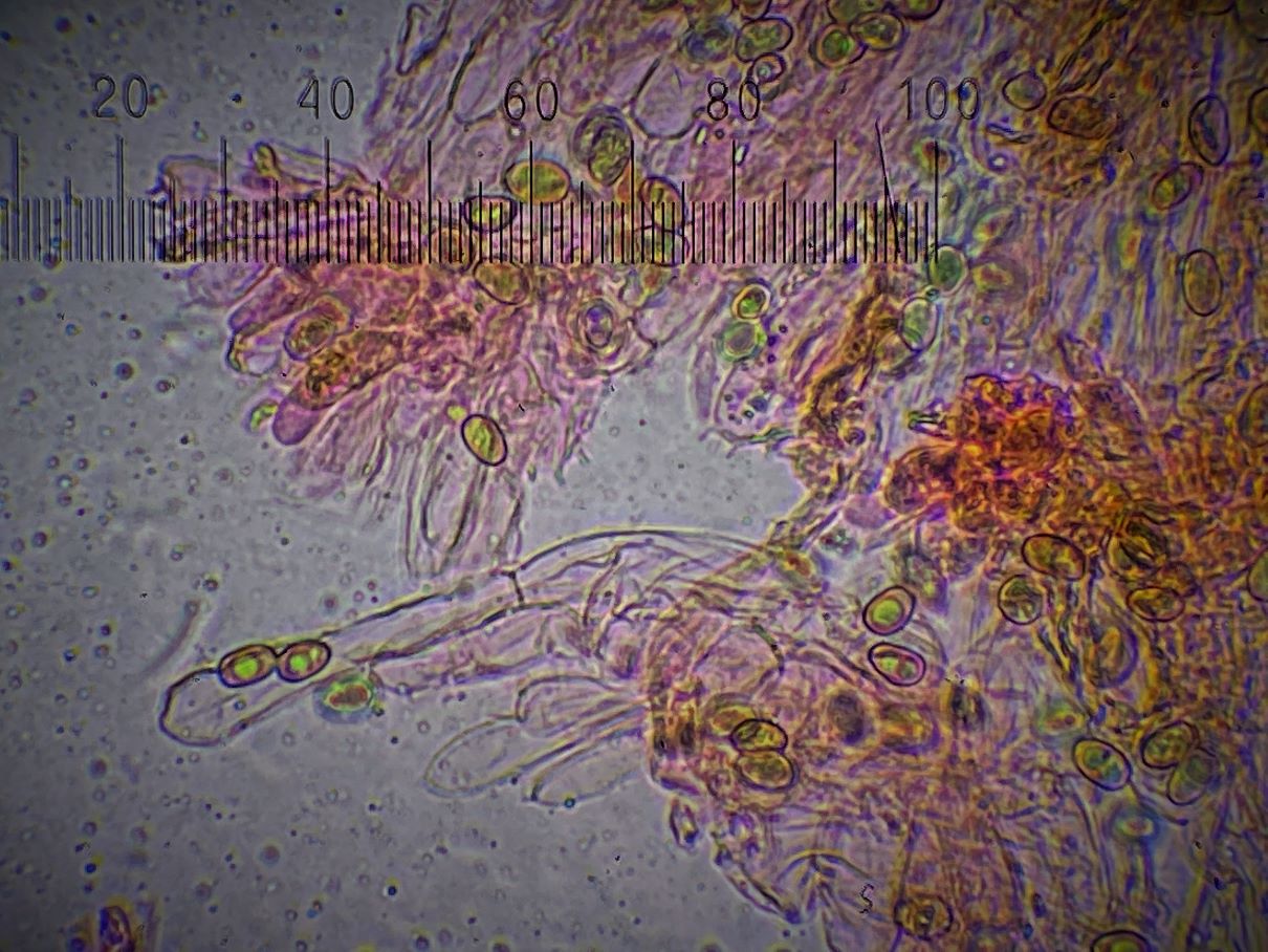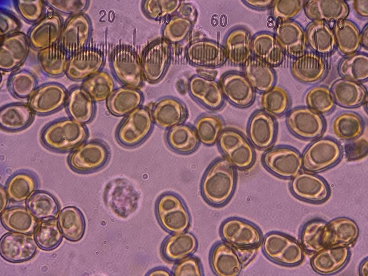 die Sporengröße ging tatsächlich bis ca. 10, 5 µm. Ich habe auch noch weitere Fotos. Z.B. seltsam gekammerte Sporen. Aber diese Fotos werden vermutlich auch nicht weiter helfen bei dem seltenen Pilz.