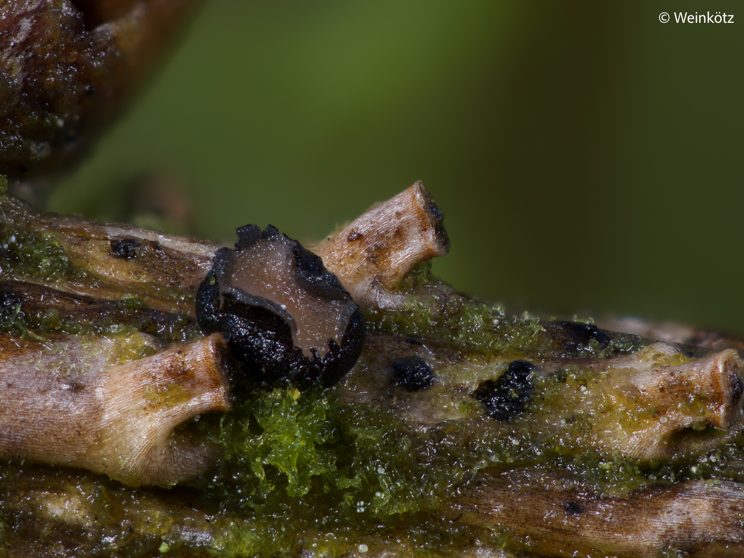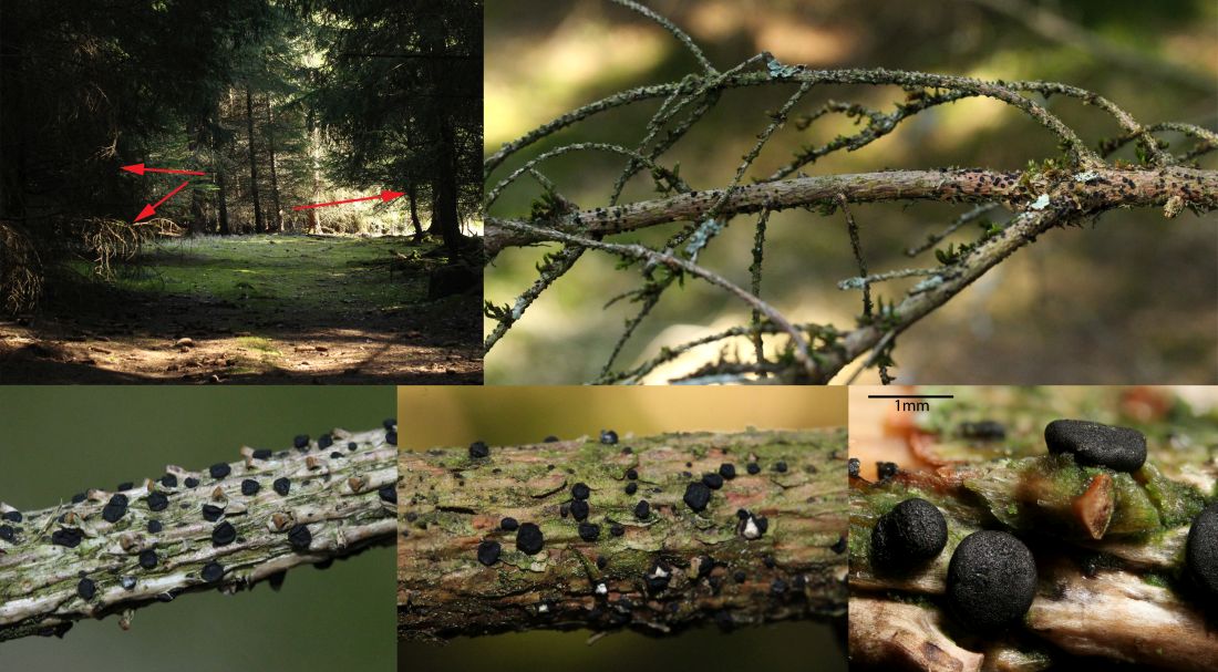 Triblidiopsis pinastri wächst (trotz des Namens pinastri) an Fichtenästen und ist mit Fruchtkörpern bis zu 1,5 (2) mm Größe recht groß für die Liga der Kleinpilze. In fichtendominierten Gebieten sicher nicht selten, jedoch fehlt sie auch bei gezielter Suche in manchen Fichtenforsten offenbar. Andererseits habe ich unweit meines Wohnorts ein Massenvorkommen davon, von dem auch die Bilder stammen.
