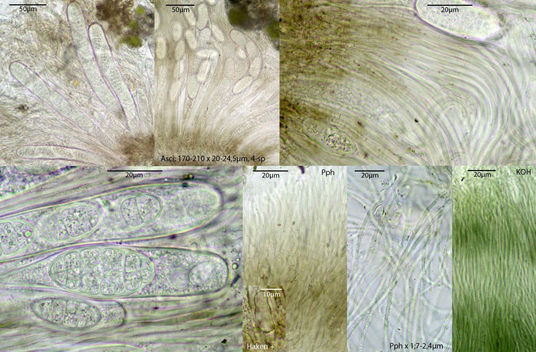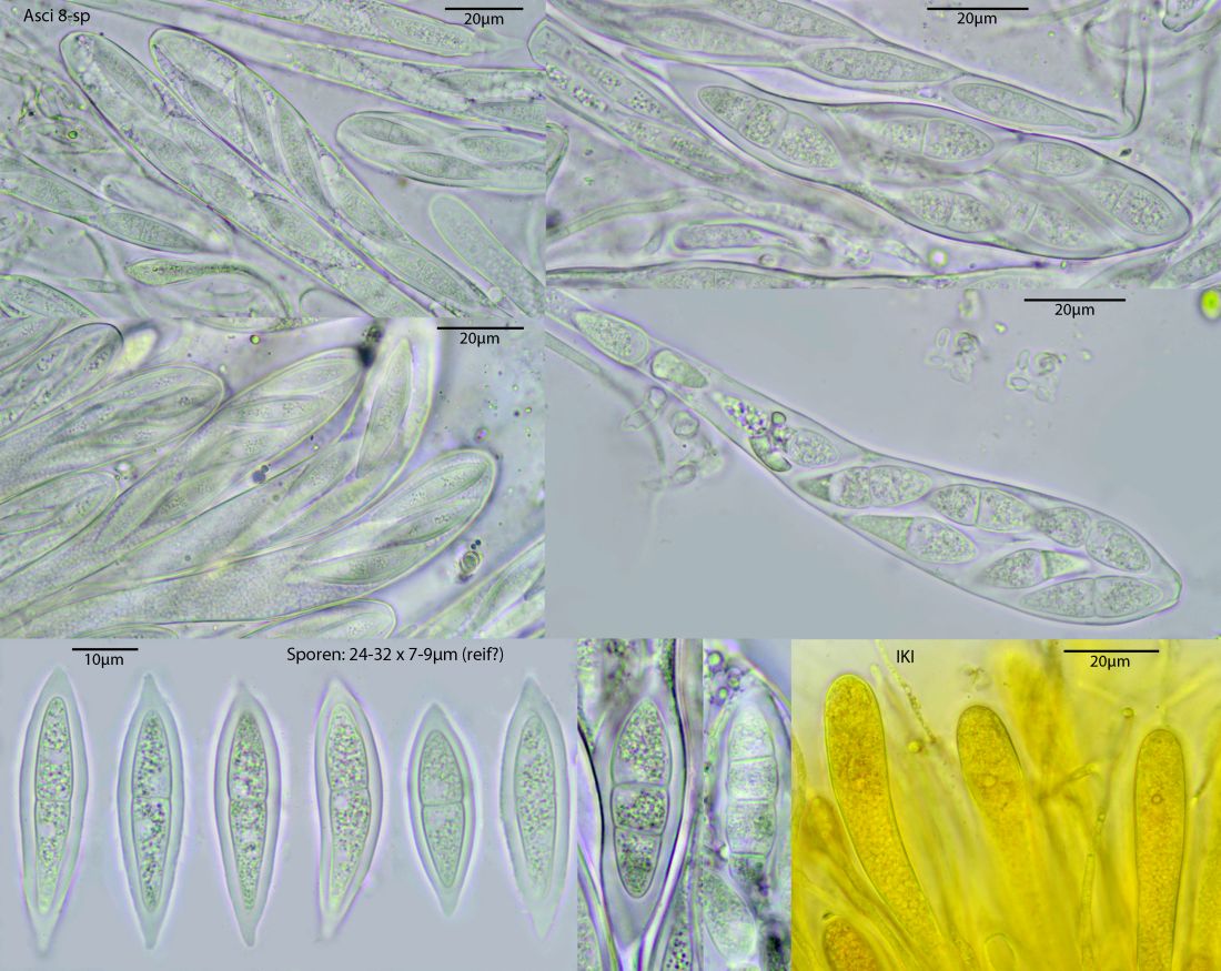 Triblidium caliciiforme ist etwa auch so groß, aber ein Laubholzbesiedler. Hier fand ich sie trocken in geschlossenem Zustand am Stamm einer alten Eiche mit stark zerklüfteter Rinde. An solchen Standorten kann man auch viele seltene Flechten entdecken. Triblidium scheint auch tatsächlich ziemlich selten, nicht nur wegen mangelnder Nachsuche. Insofern wäre jeder Fund natürlich interessant. DIe mauerförmigen Sporen erinnern an Pleospora, sind aber auch vollreif farblos und haben anstelle vieler Septen eine Art innere Kammerung mit dicken Wänden außen.