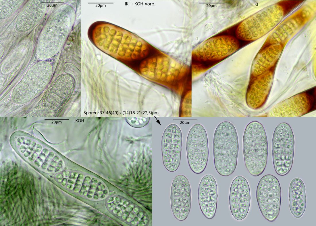 Triblidium caliciiforme ist etwa auch so groß, aber ein Laubholzbesiedler. Hier fand ich sie trocken in geschlossenem Zustand am Stamm einer alten Eiche mit stark zerklüfteter Rinde. An solchen Standorten kann man auch viele seltene Flechten entdecken. Triblidium scheint auch tatsächlich ziemlich selten, nicht nur wegen mangelnder Nachsuche. Insofern wäre jeder Fund natürlich interessant. DIe mauerförmigen Sporen erinnern an Pleospora, sind aber auch vollreif farblos und haben anstelle vieler Septen eine Art innere Kammerung mit dicken Wänden außen.