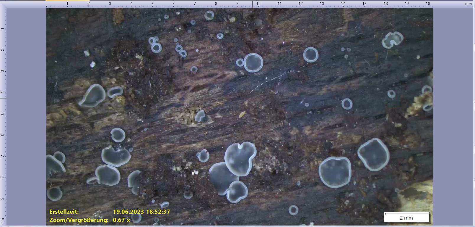 Substrat -> altes morsches Laubholz, am Boden aufliegend -> FK zum Boden ausgerichtet.
