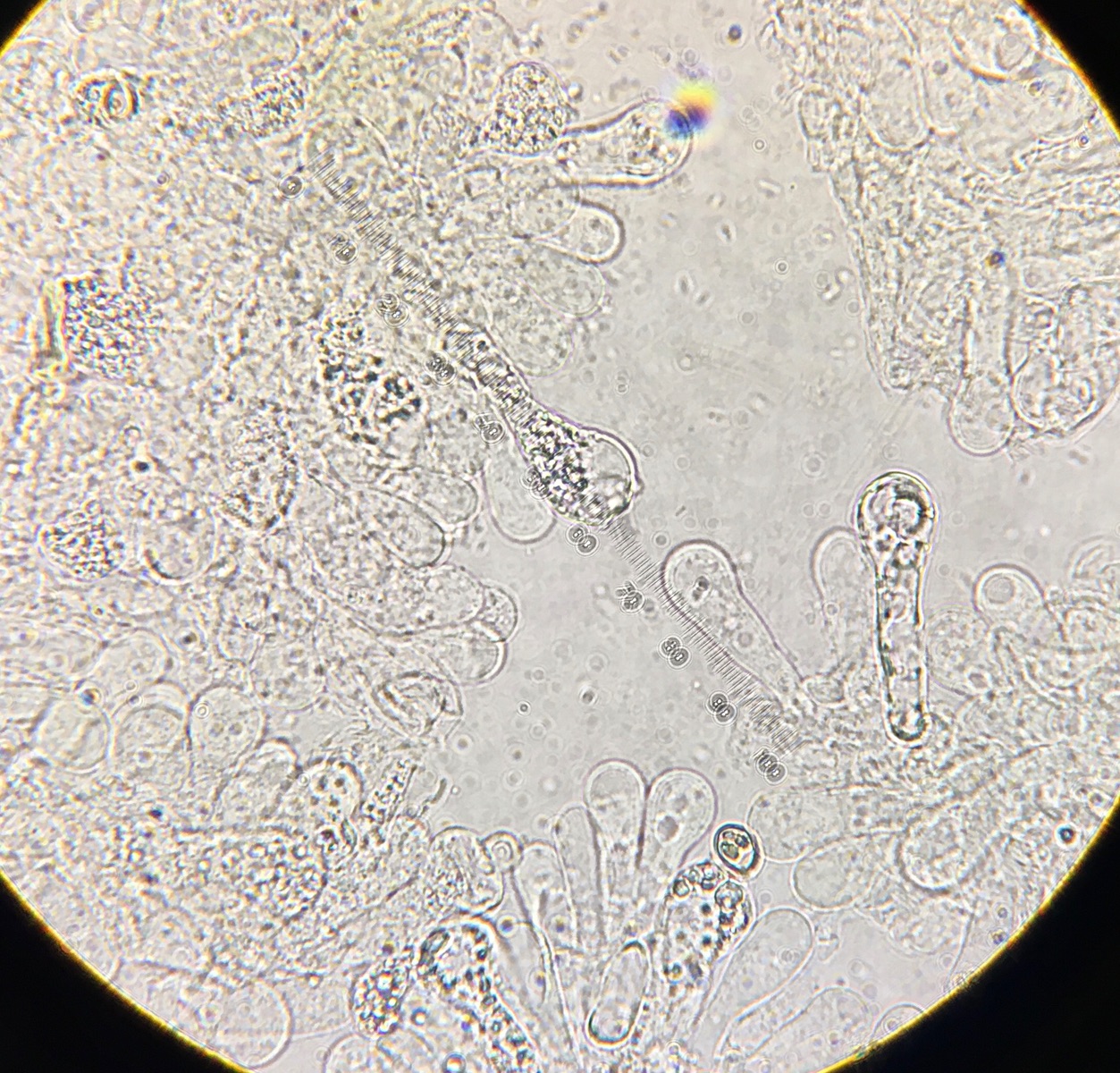 Die Zystiden sehen sehr unterschiedlich aus, manch haben so etwas wie einen Belag, andere wirken zweiteilig (wenn ich das richtig interpretiere), jedenfalls habe ich keinen Kristallschopf gesehen.