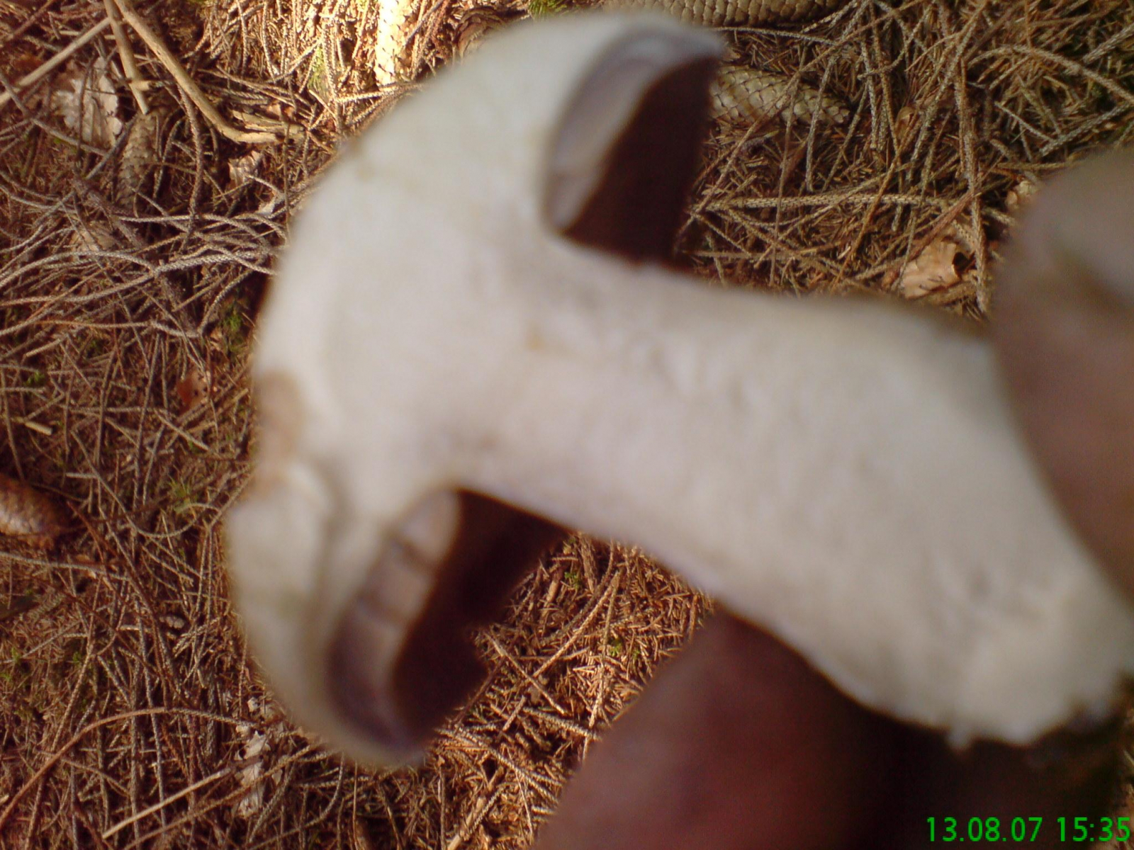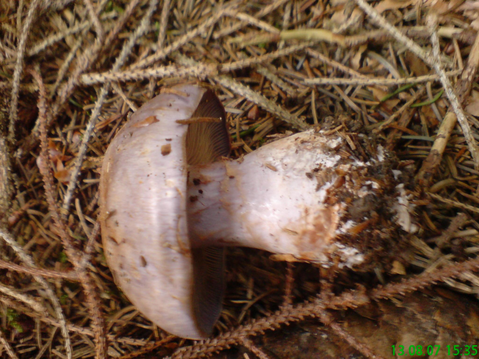 -> Cortinarius caesiocanescens - Violetter Klumpfuss, Fleisch weißlich aber im Stiel blassbräunlich. In Nadelwälder.