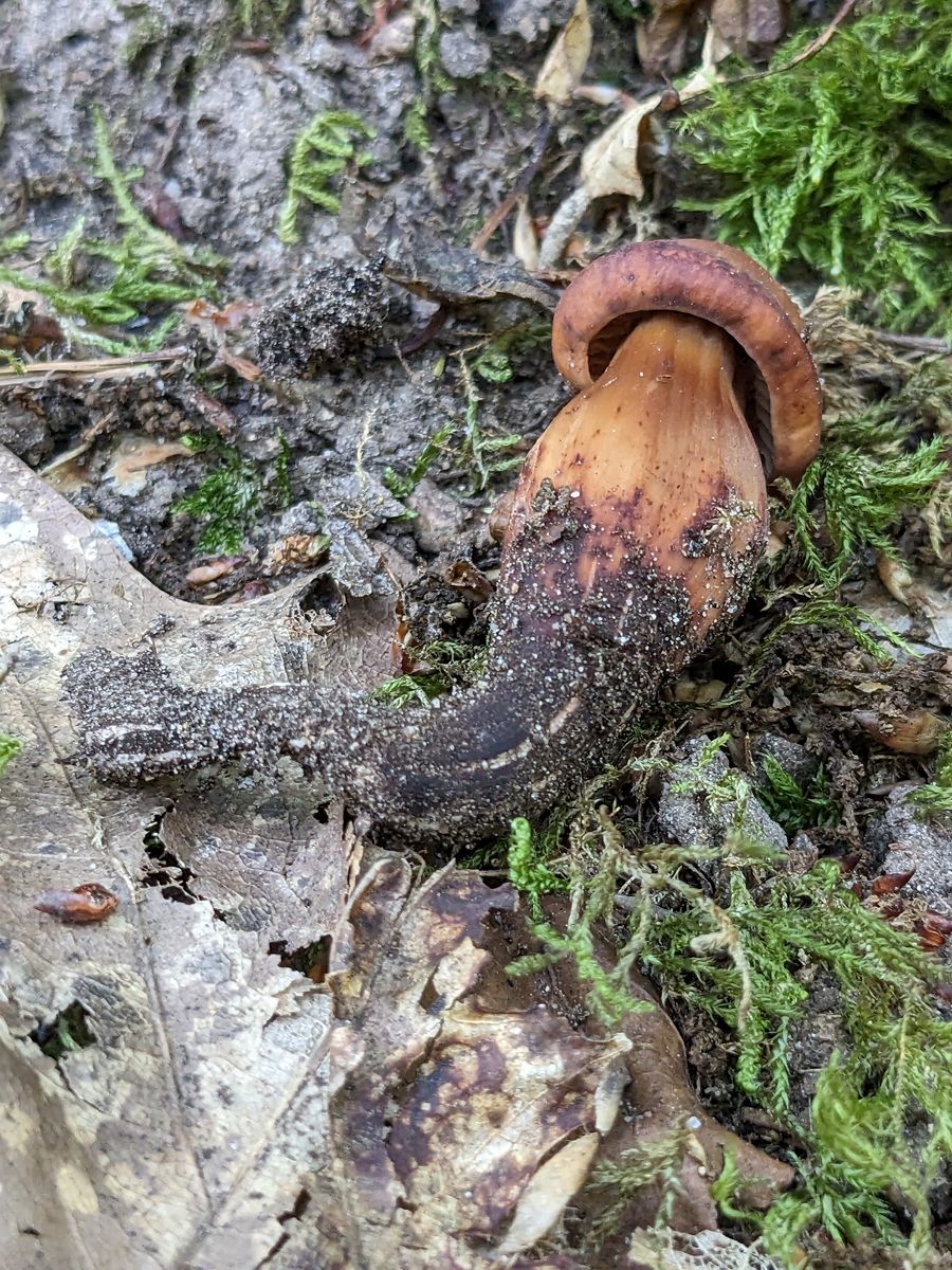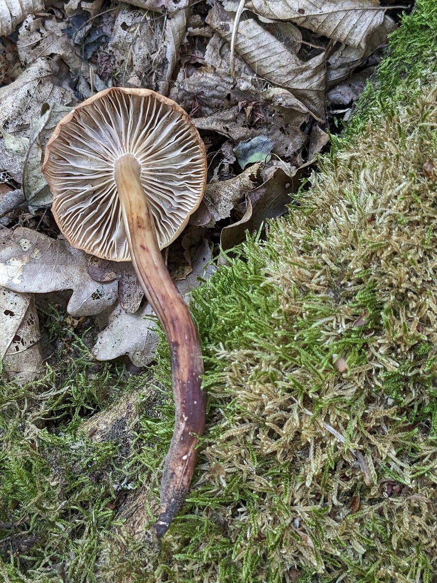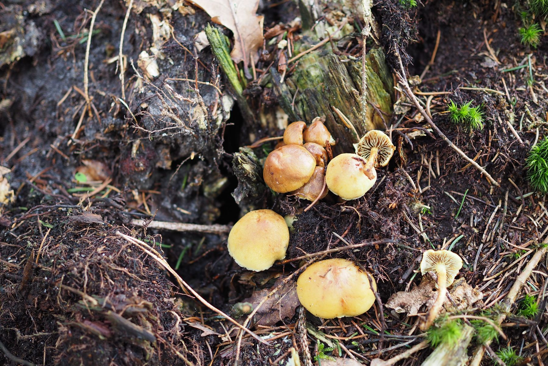am 14. März habe ich hier in einem Fichten / Eichenbestand an einer im Wurzelbereich umgeknickten dünnen Eiche einige Pilze gefunden, die ich nicht zuordnen kann. Ich tendiere zum Spindeligen Rübling Collybia fusipes. Zum Geruch und zur Farbe des Sporenpulvers kann ich nichts sagen.