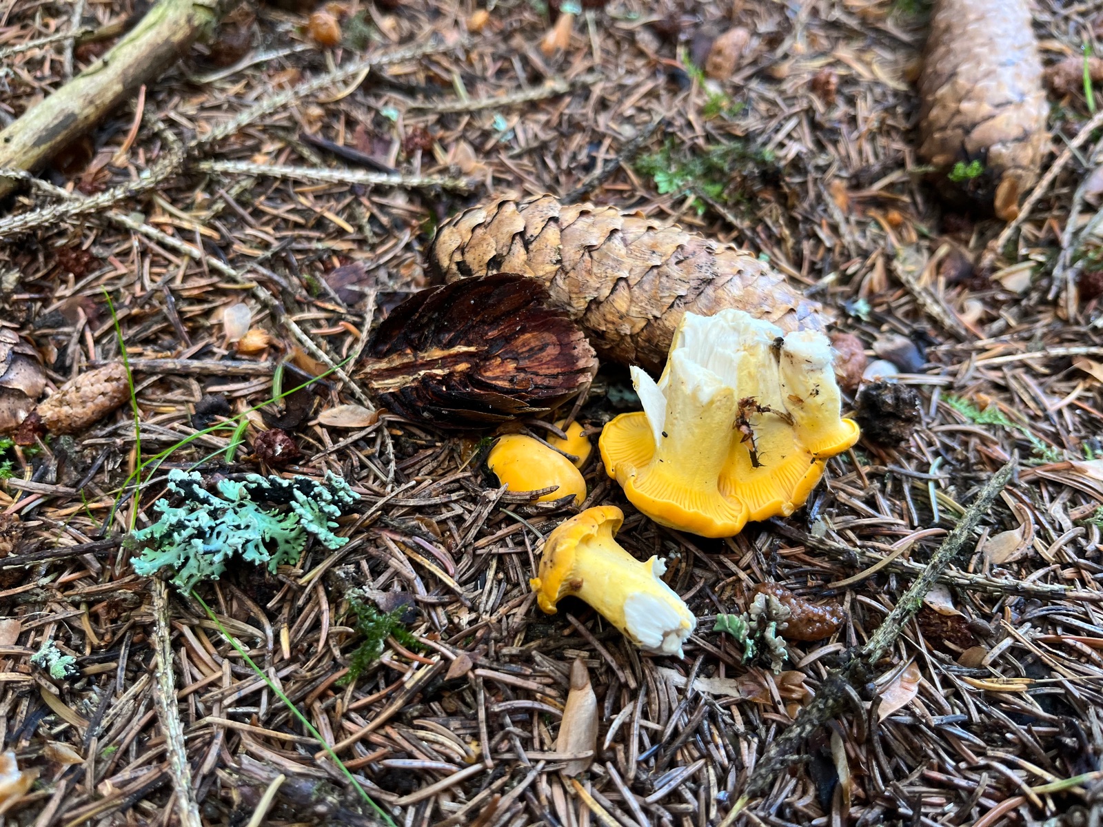 Und sogar zwei erntewürdige Pfifferlinge. Allerdings die einzigen, zumal an einem sehr bachnahen Standort.