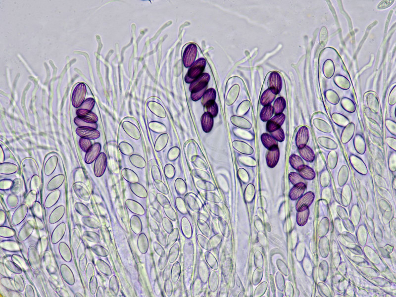 Zwischen den breit endenden Asci und kopfigen Paraphysen findet sich reichlich bräunlich- violettes amorphes Pigment