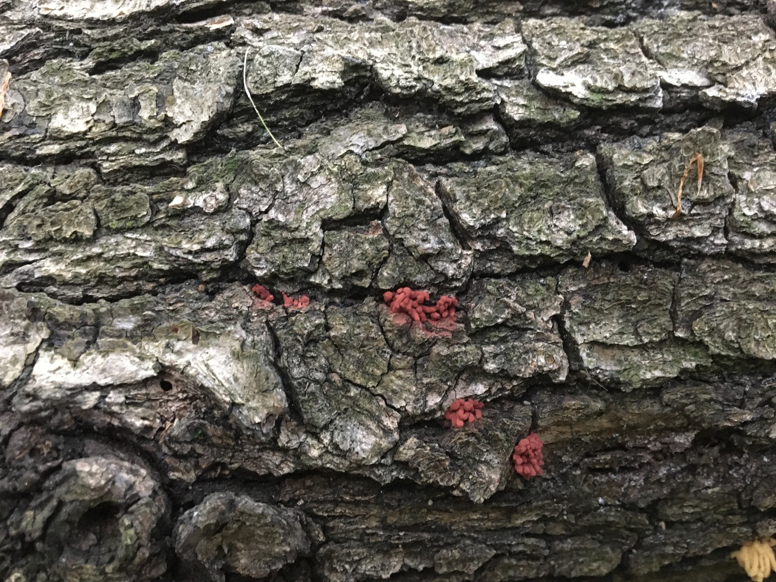 Den zweiten Schleimpilz fand ich im Burgenland und er wuchs neben einem Stamm auf dem Boden, zum Teil auch auf Grasresten und Zweigen. Er hat eine im Vergleich zum ersten eher rundliche Form mit Stielchen.