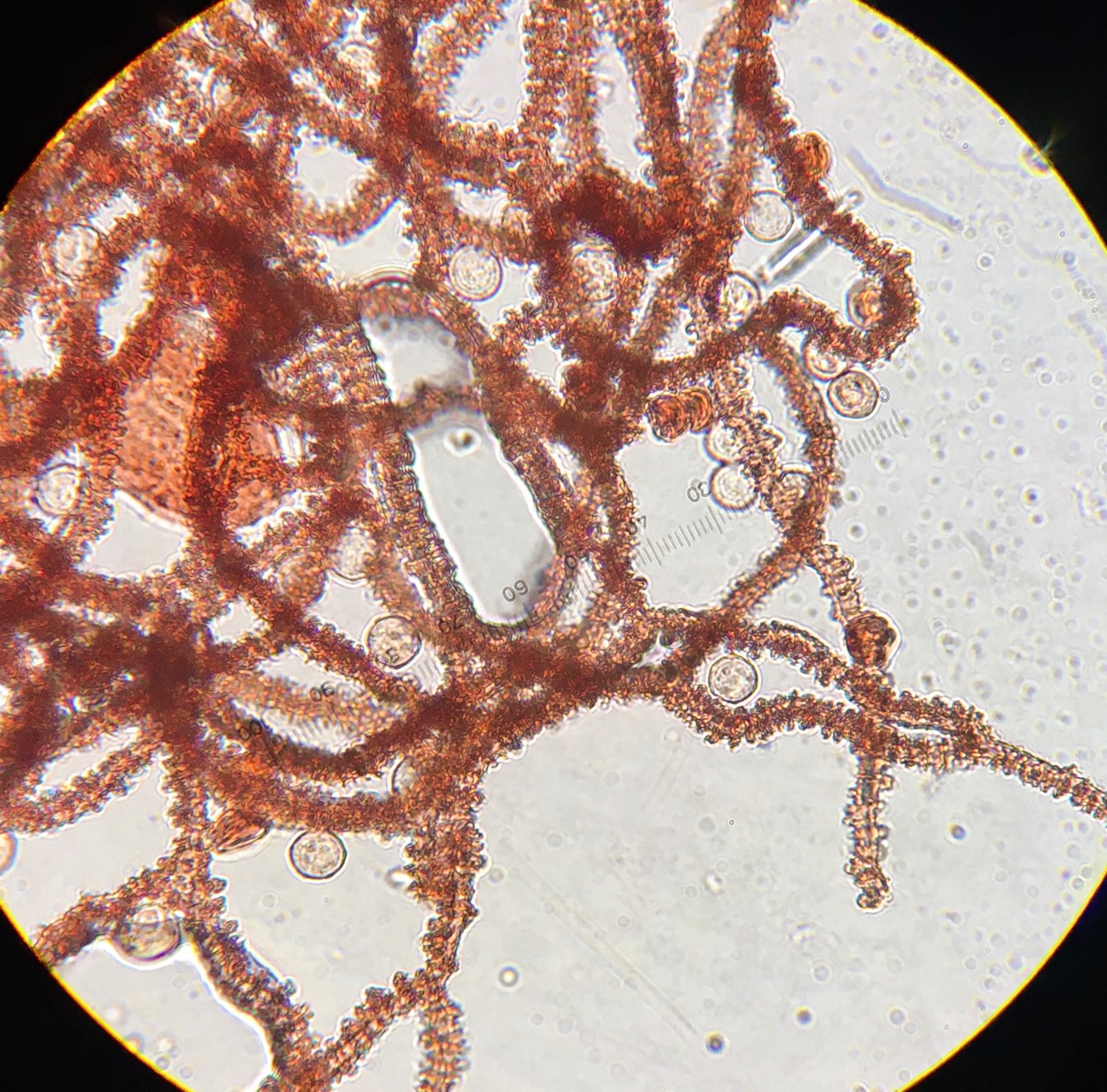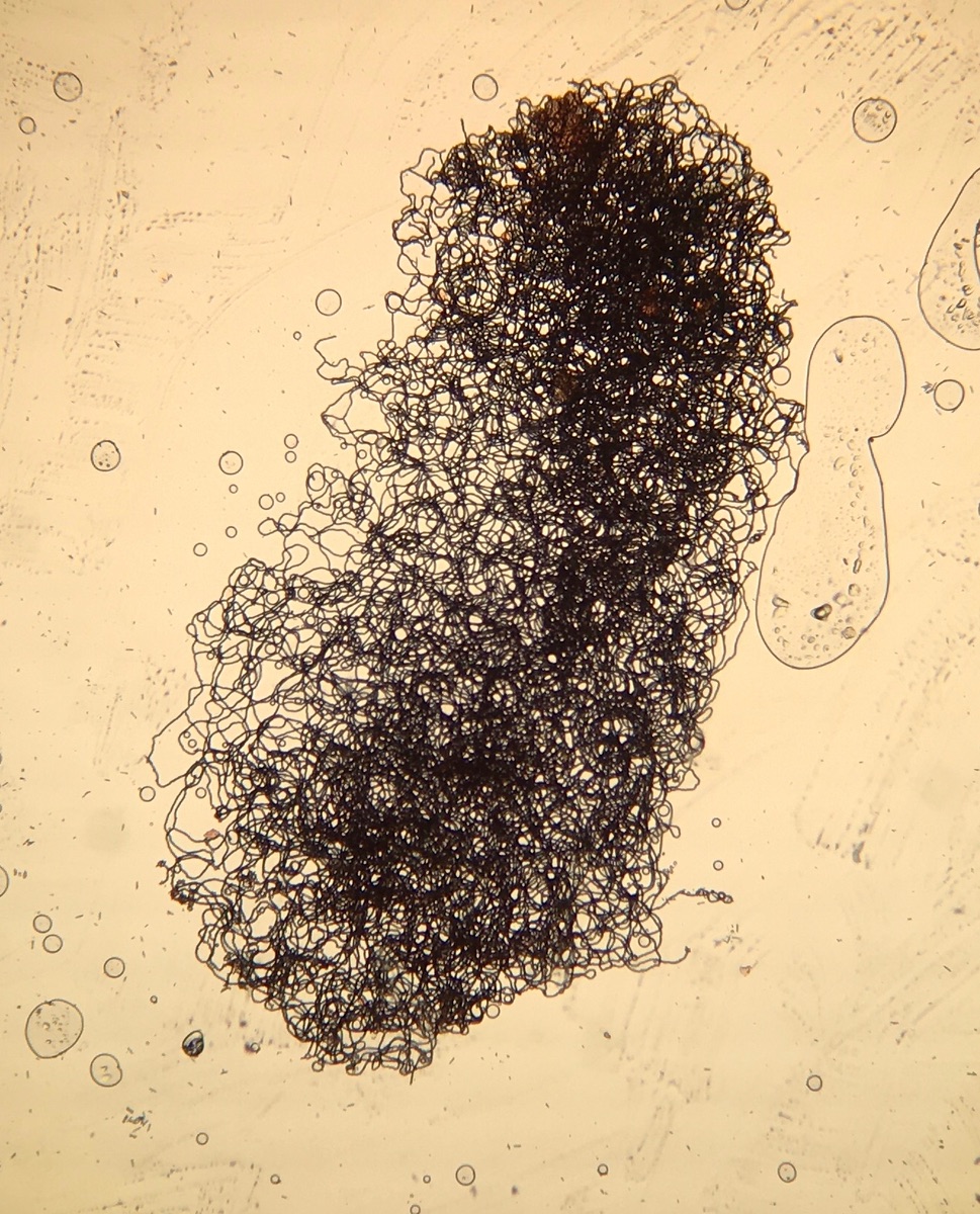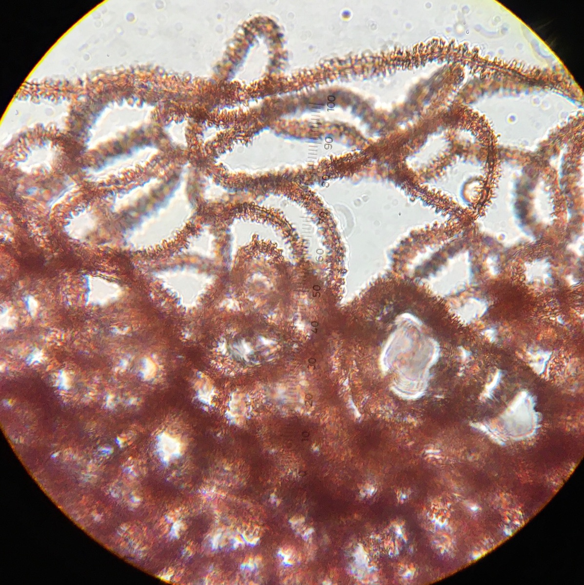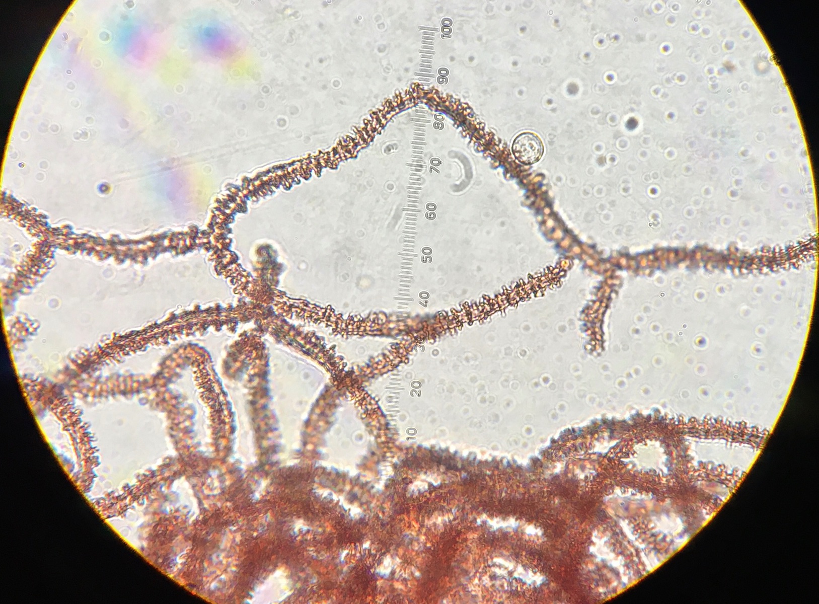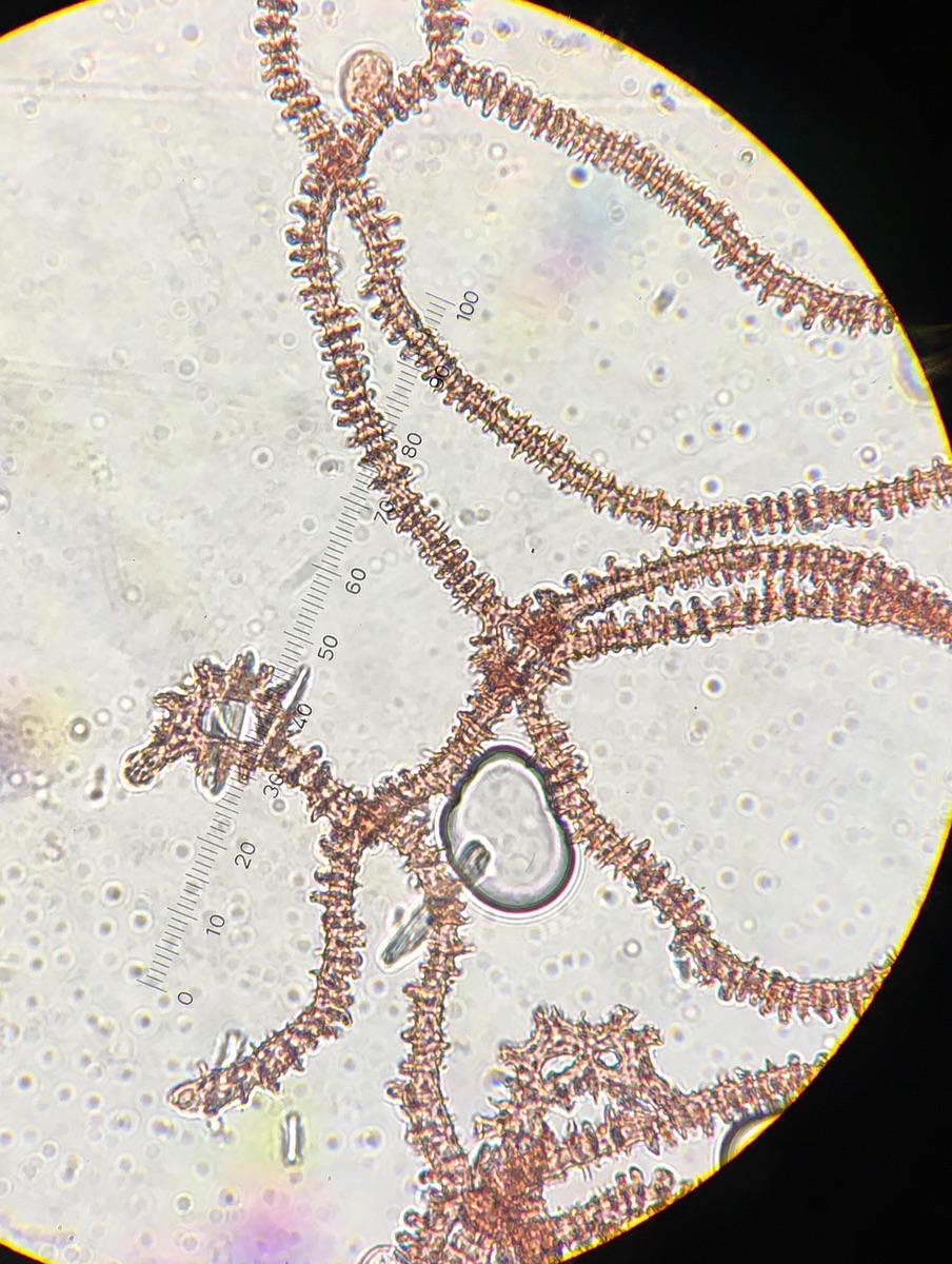 Das Capillitium misst ohne Ornament ca. 3 - 4 im Durchmesser und hat auffällige kleine Schlingen. Es war leicht vom gestielten Becherchen lösbar und zum Teil hatte es noch ‚Käppchen‘.