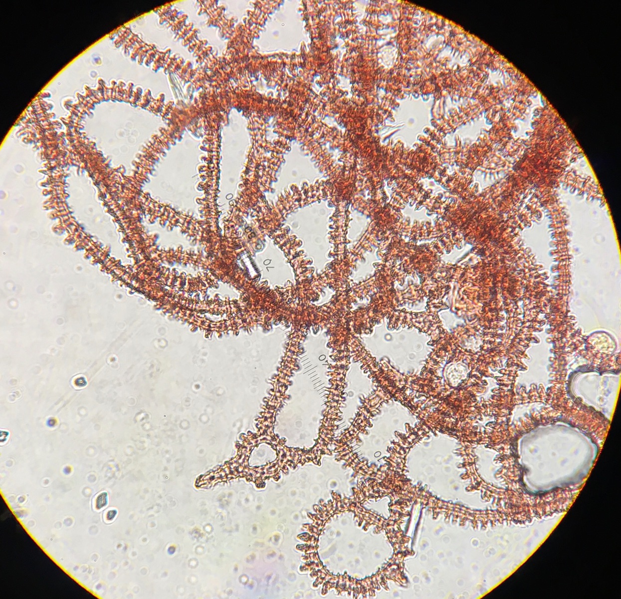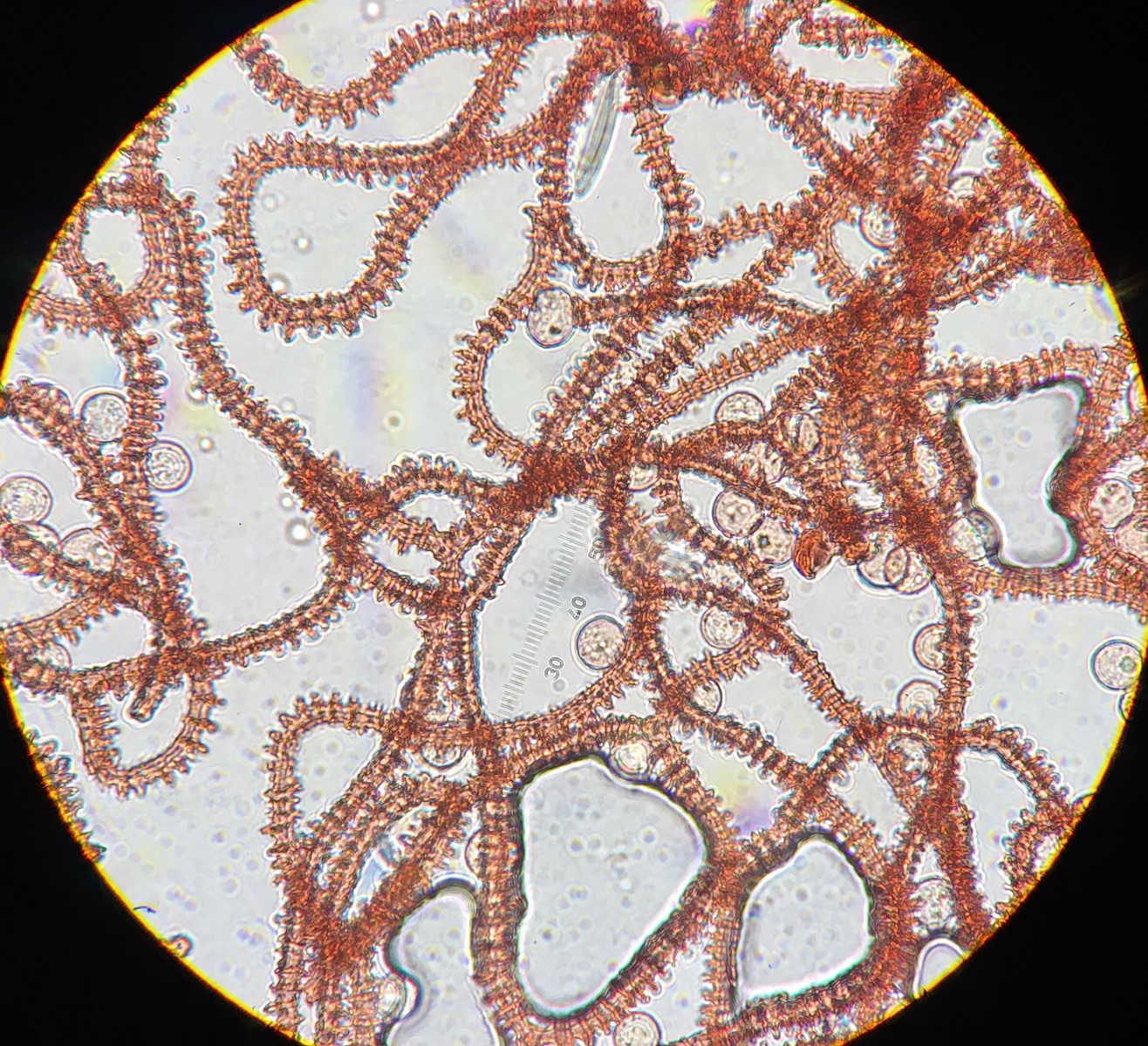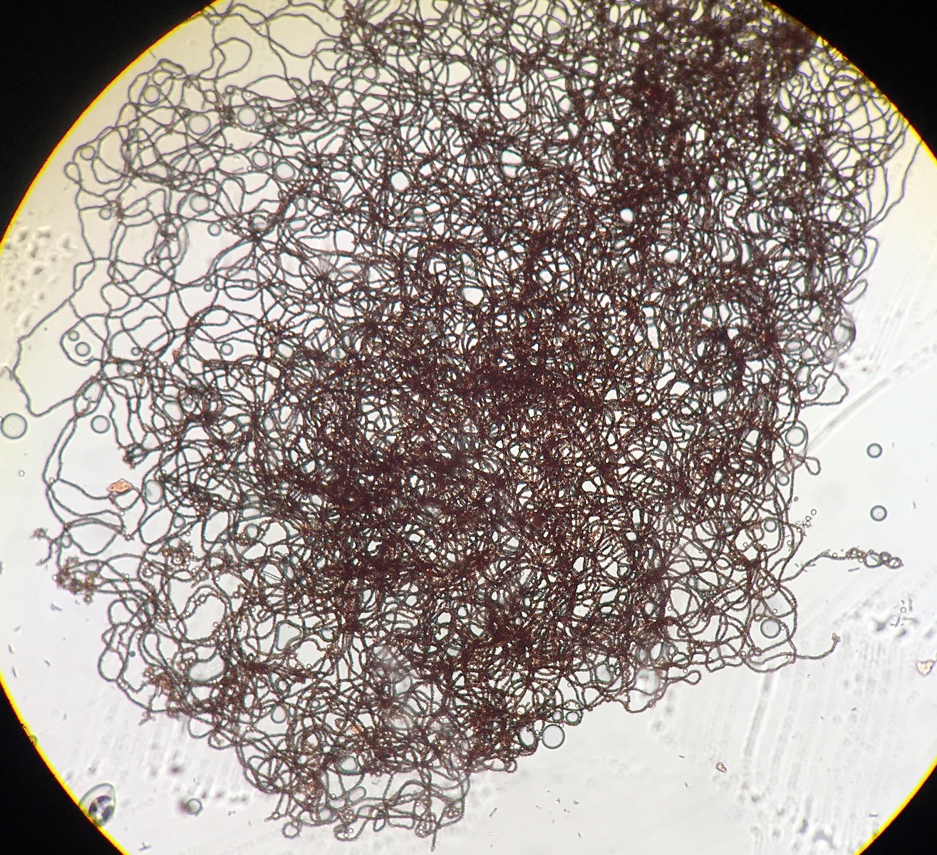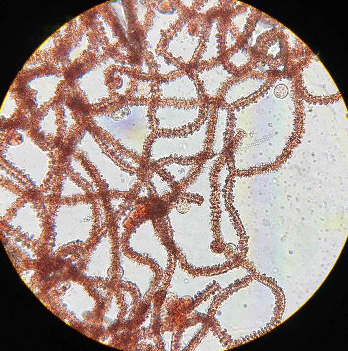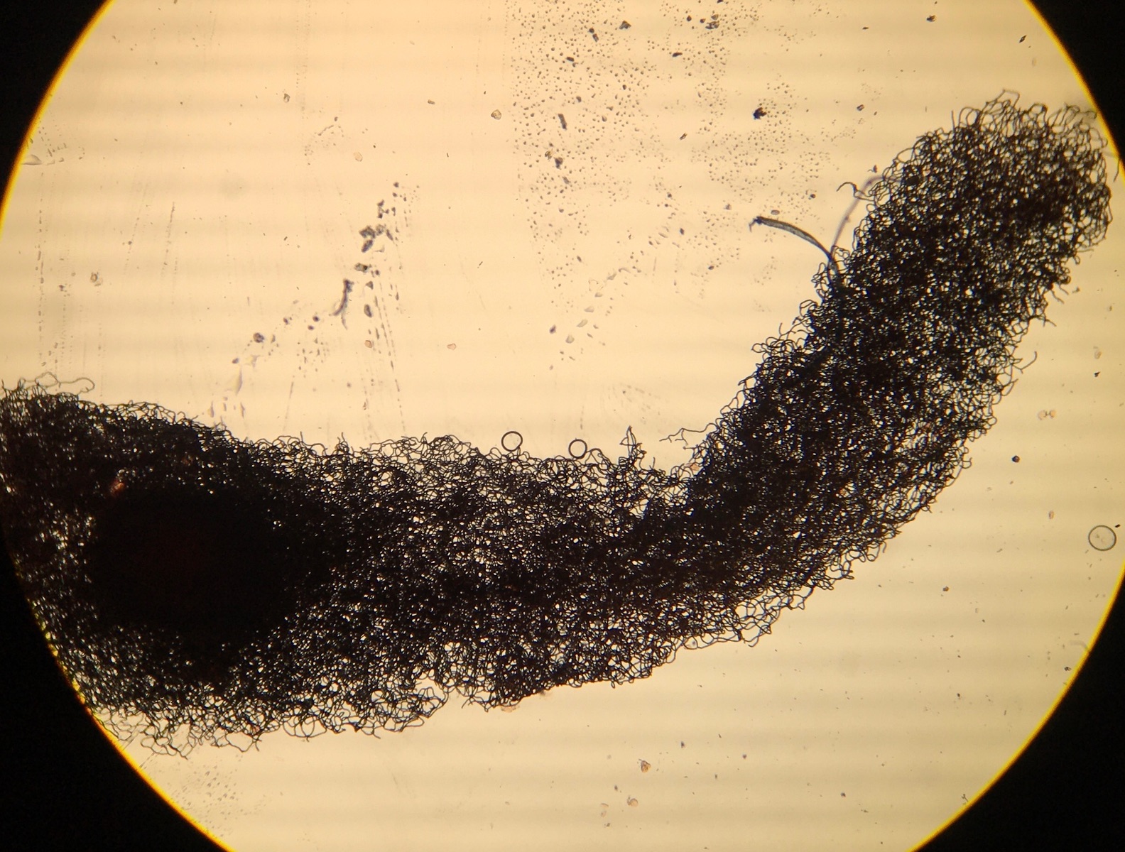 Das Capillitium misst ohne Ornament ca. 3 - 4 im Durchmesser und hat auffällige kleine Schlingen. Es war leicht vom gestielten Becherchen lösbar und zum Teil hatte es noch ‚Käppchen‘.