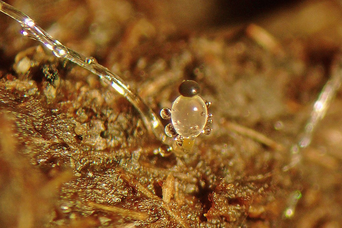 Auch wenn ich dem folgenden Pilz keinen Namen geben konnte, zeige ich ihn euch gern. Mal wieder ein Pillenwerfer (Pilobolus spec.), der sein Sporangium abschoss, als ich ihn mit der Präpariernadel berührte. :(