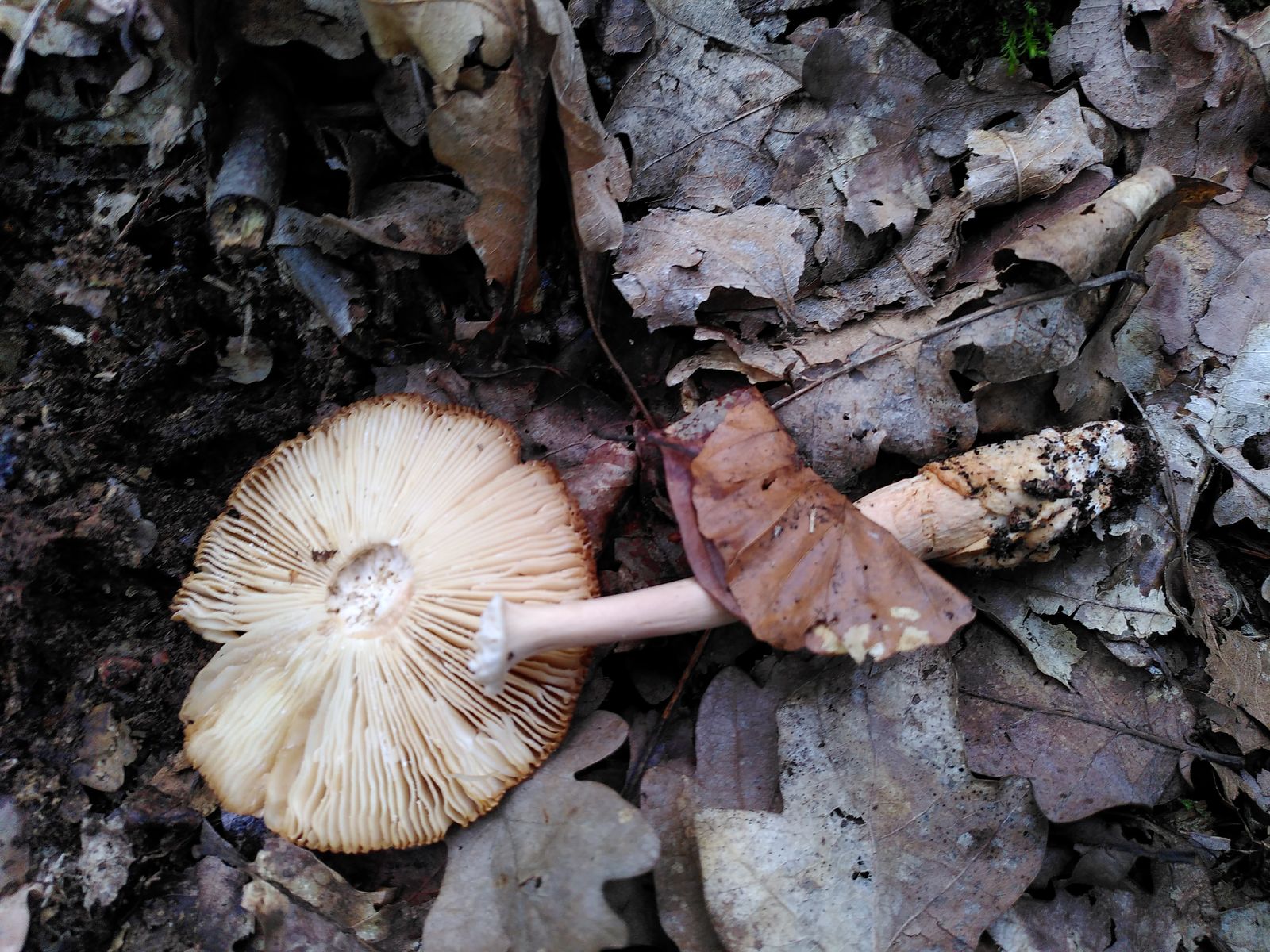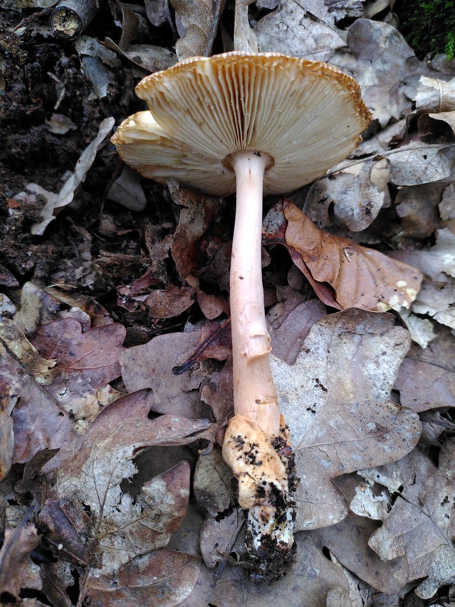 Stiel: weiß-bräunlich, glatt, Basis mit anliegender, weißer, rotbraun gefleckter Volva
