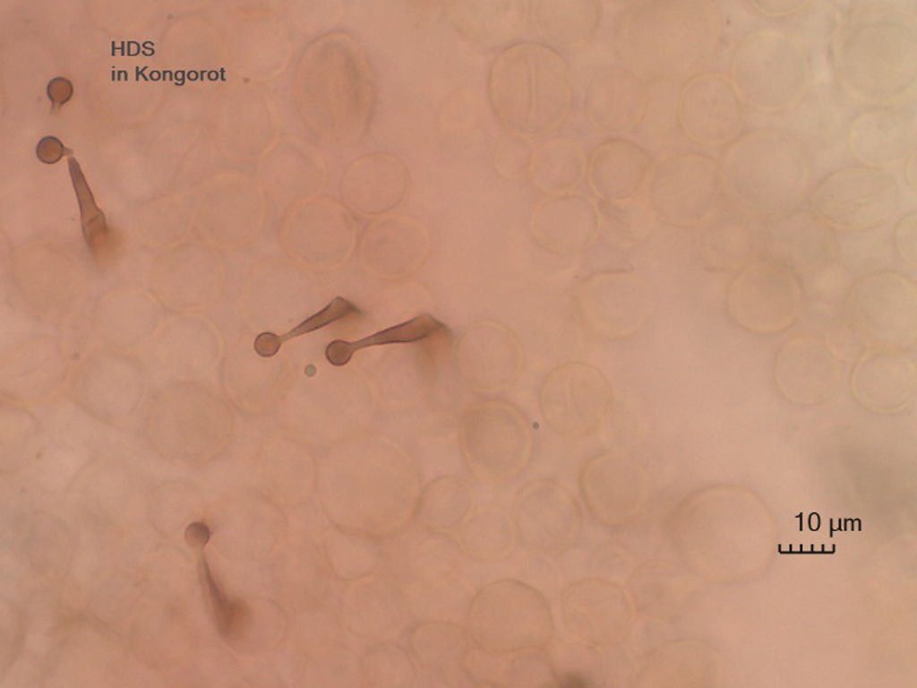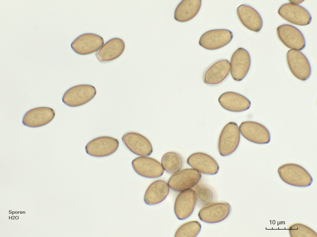 Die Sporen sind dickwandig mit auffälligen Keimporus: 10,1-10,6-11.3 x 5,9-6,2-6,4µ