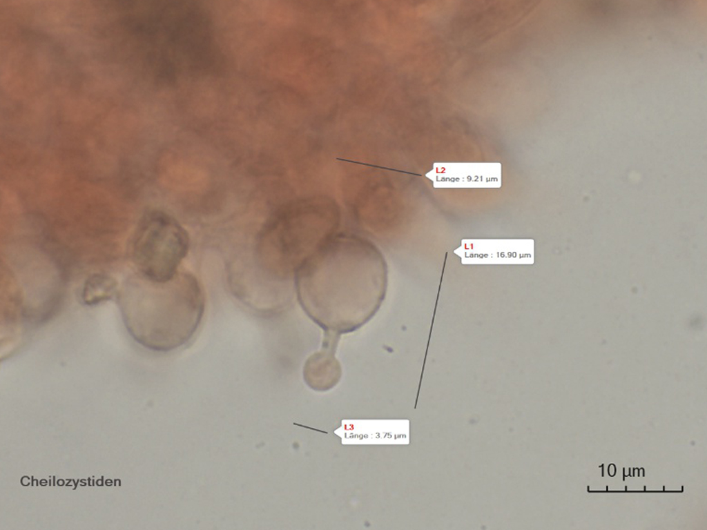 Cheilozystiden sind deutlich gedrungener als obrige Pileozystiden aber ebenso kleinköpfig
