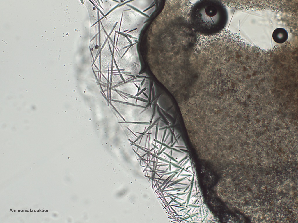 Eine Reaktion mit Ammoniak zeigt rasch Kristalle