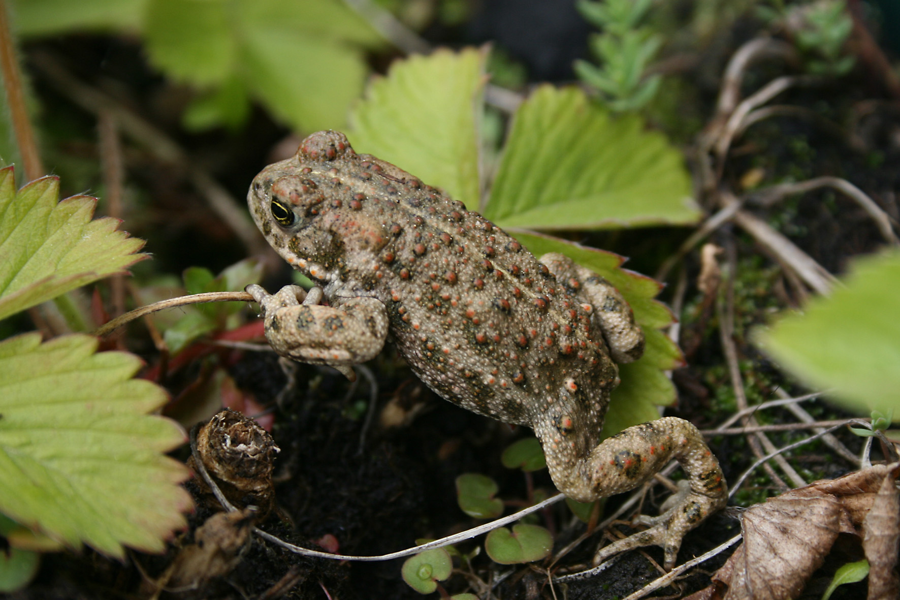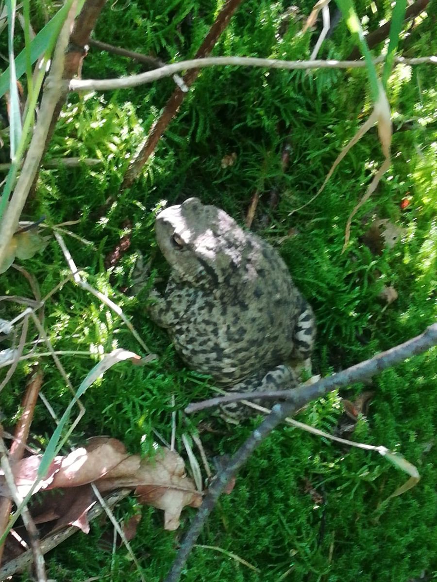 Eine Blindschleiche war zu schnell für mich, aber dieser pummelige Geselle hat sich nicht an mir gestört. Vielleicht eine Kreuzkröte?