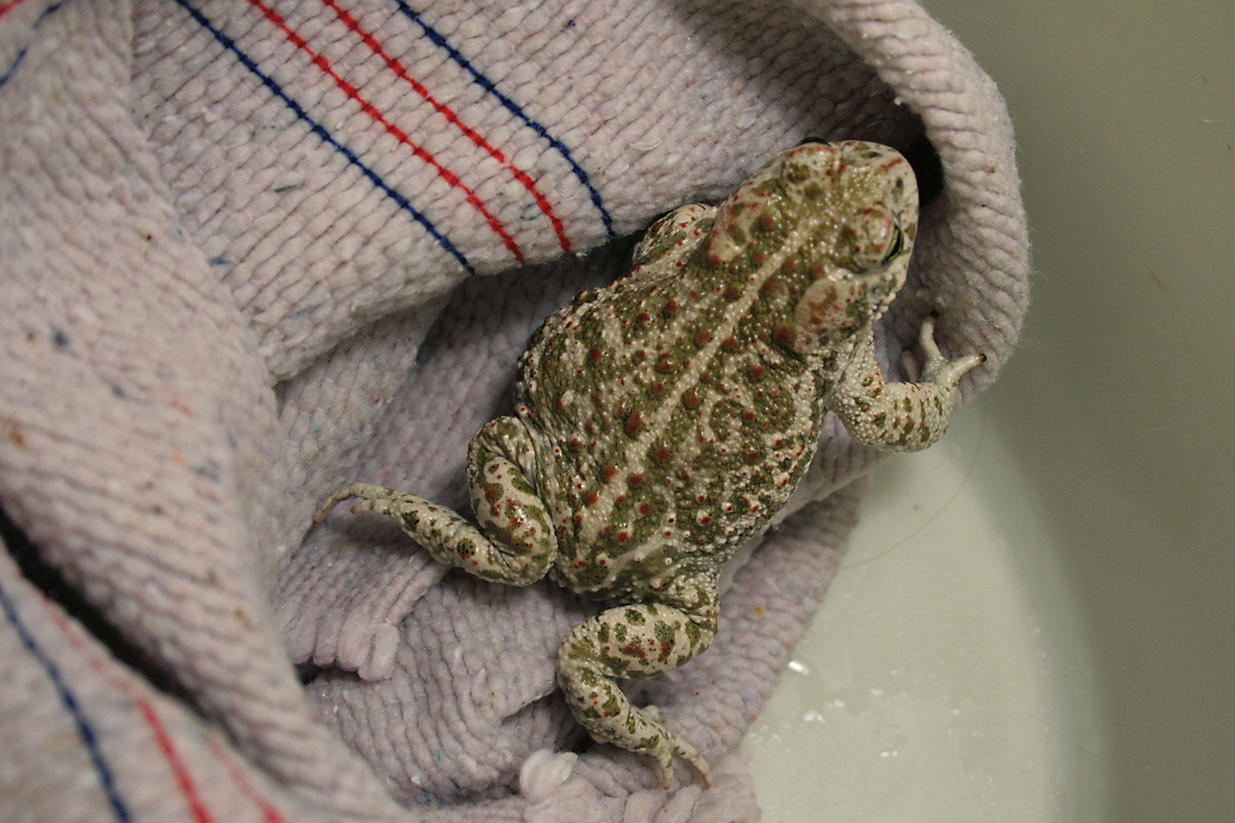 Deine Kröte hat ein ausgeprägt fleckiges Muster, waagrechte Pupillen und keinen hellen Strich auf dem Rücken ––> Wechselkröte.