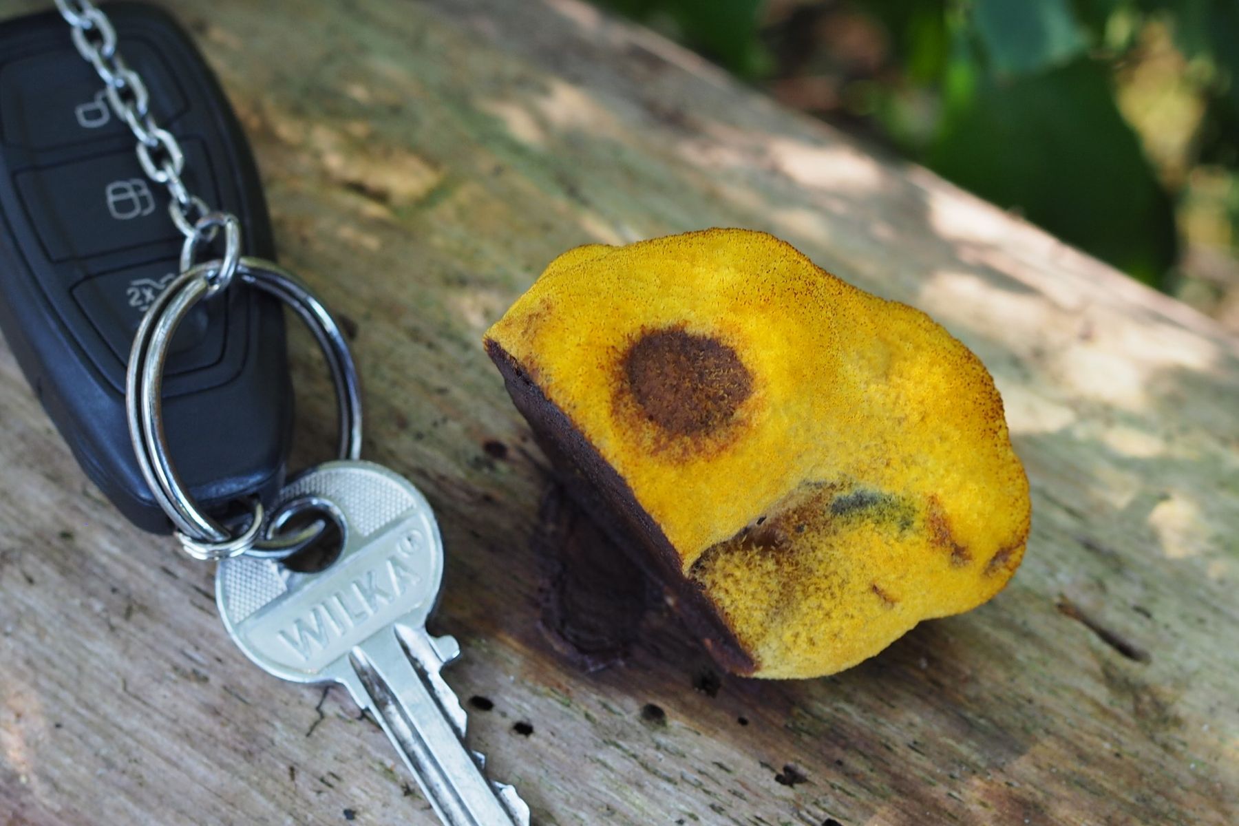 Bild 4: Der Pilz mit bräunender Druckstelle und Schlüssel zum Größenvergleich
