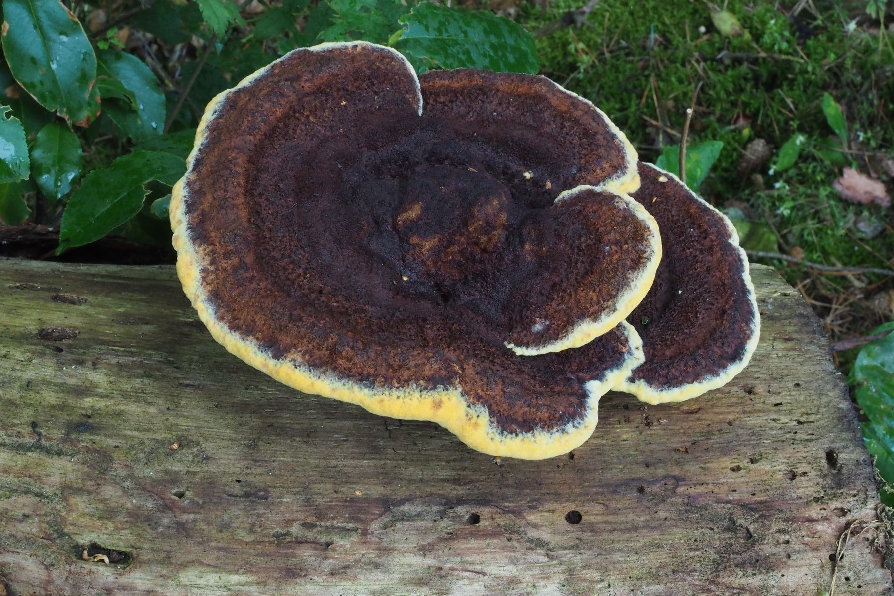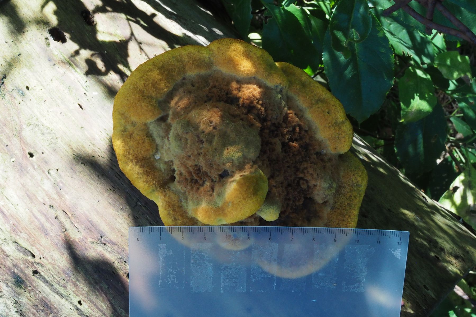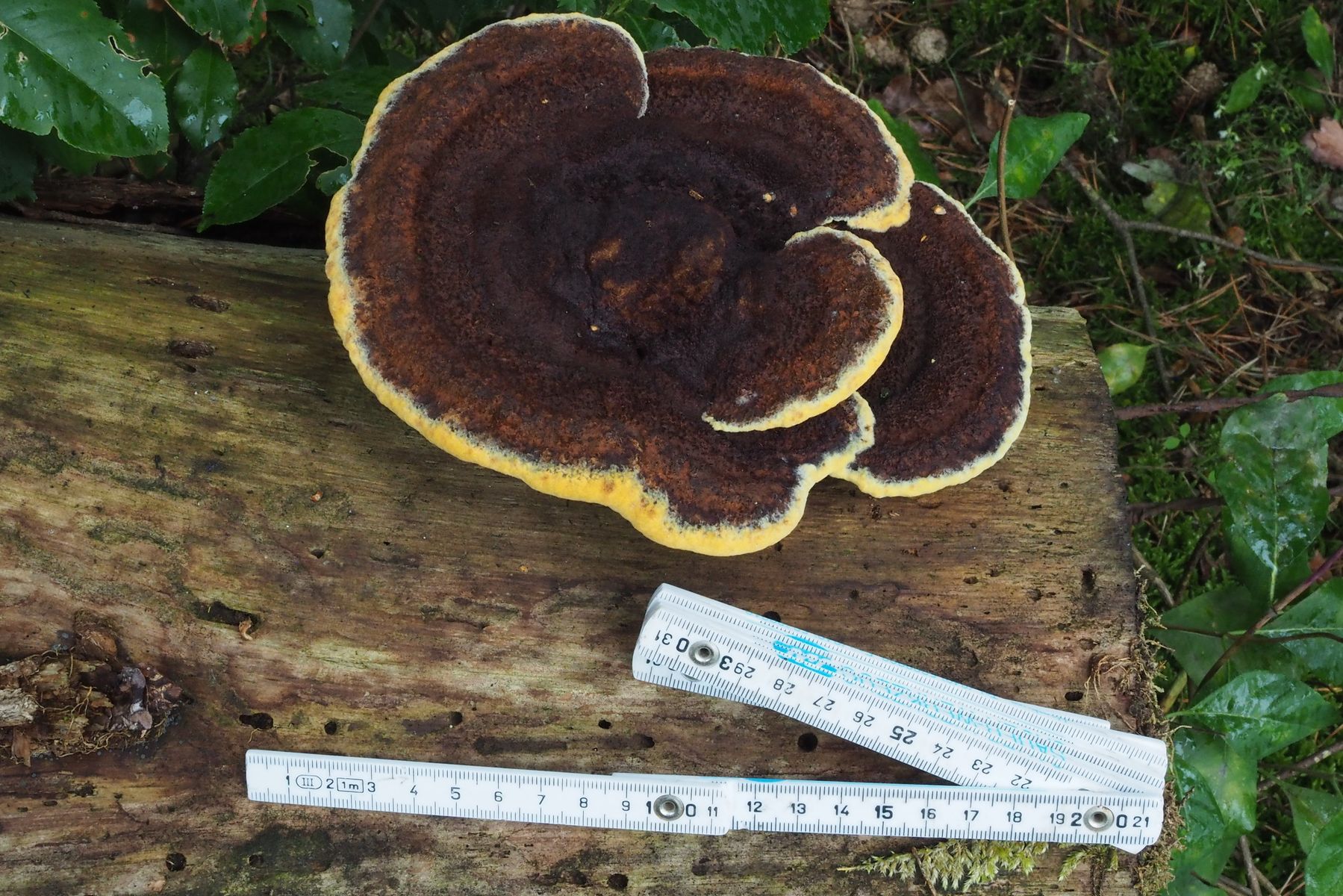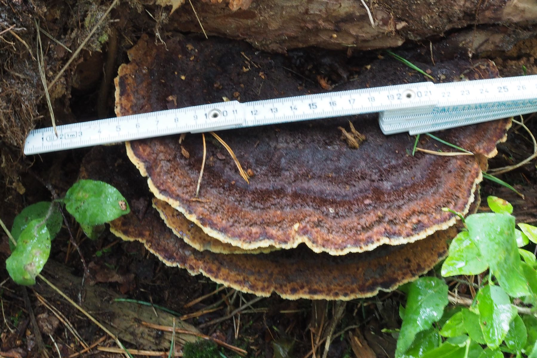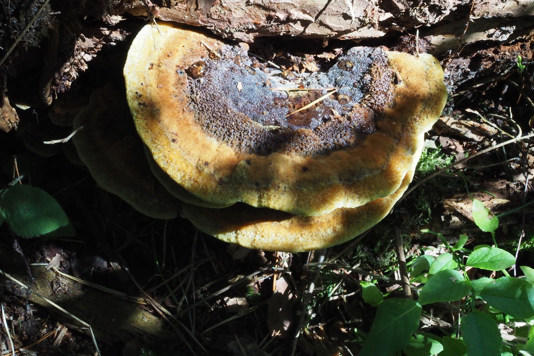 Anhand von Vergleichsbildern würde ich sagen, dass ich hier den Kiefern-Braunporling Phaeolus spadiceus gefunden habe.