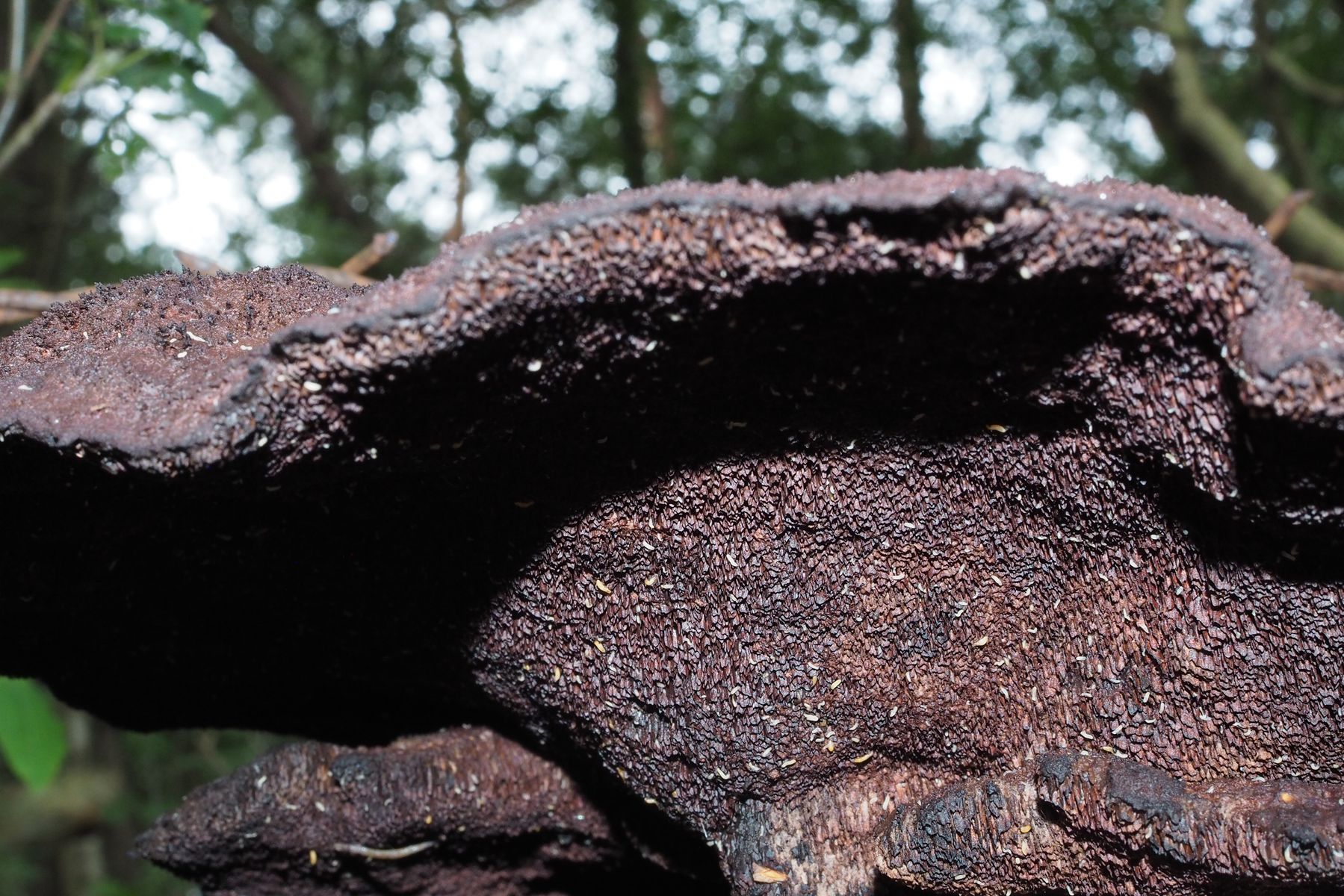 Der Pilz war sehr fest am Holz angewachsen und hatte unterhalb am dicken "Stiel", der eigentlich keiner war, Glutationstropfen.