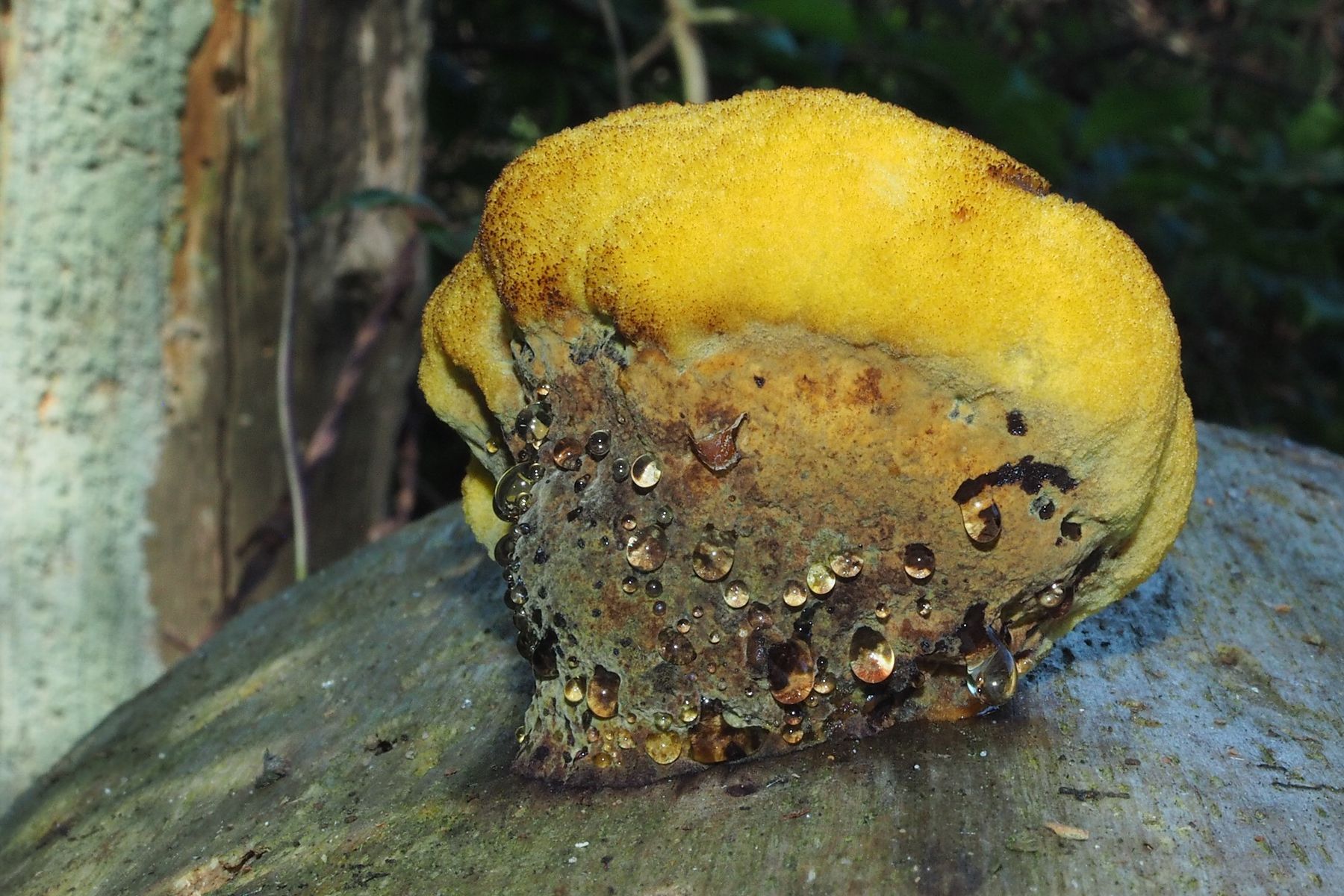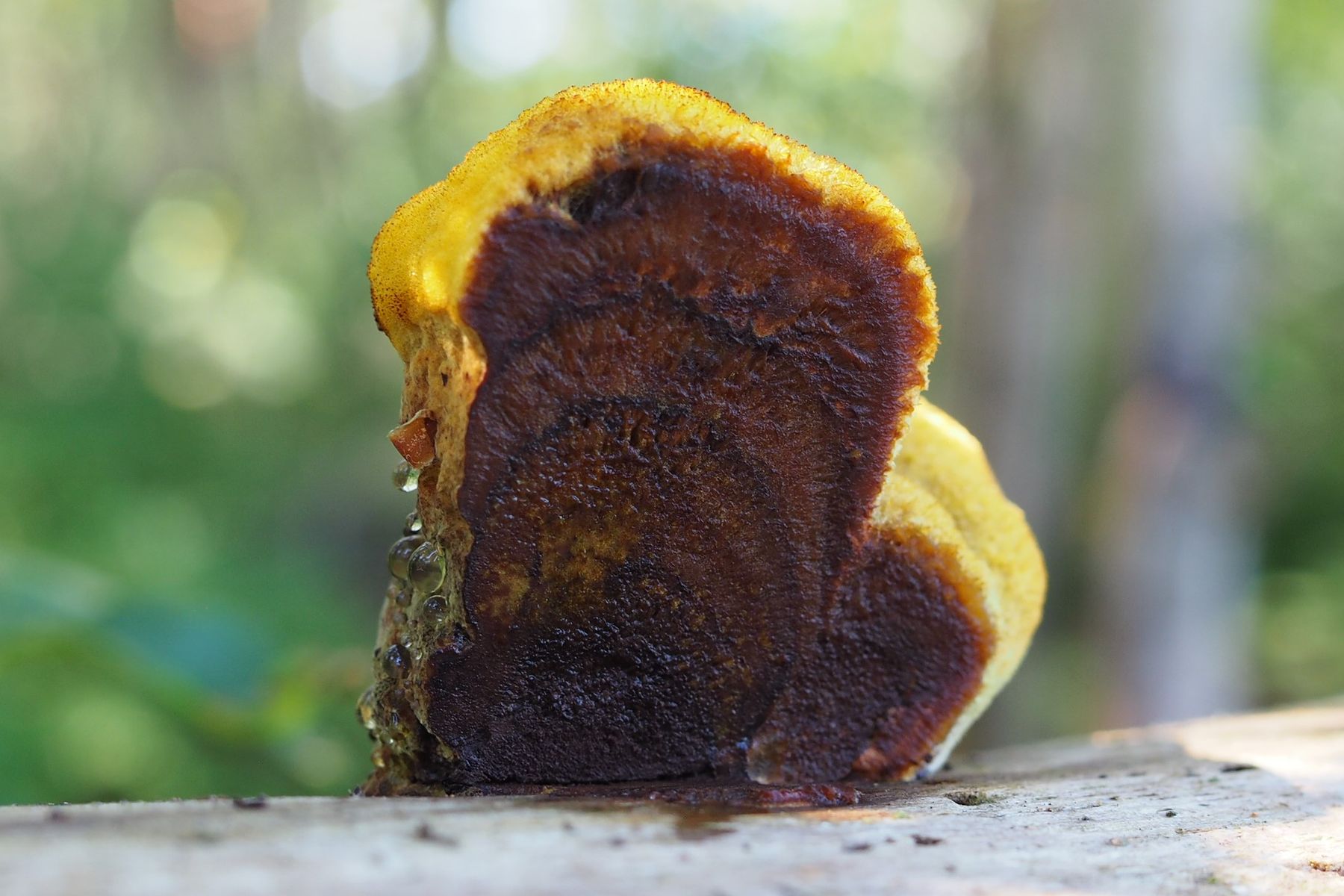 Der Pilz war sehr fest am Holz angewachsen und hatte unterhalb am dicken "Stiel", der eigentlich keiner war, Glutationstropfen.