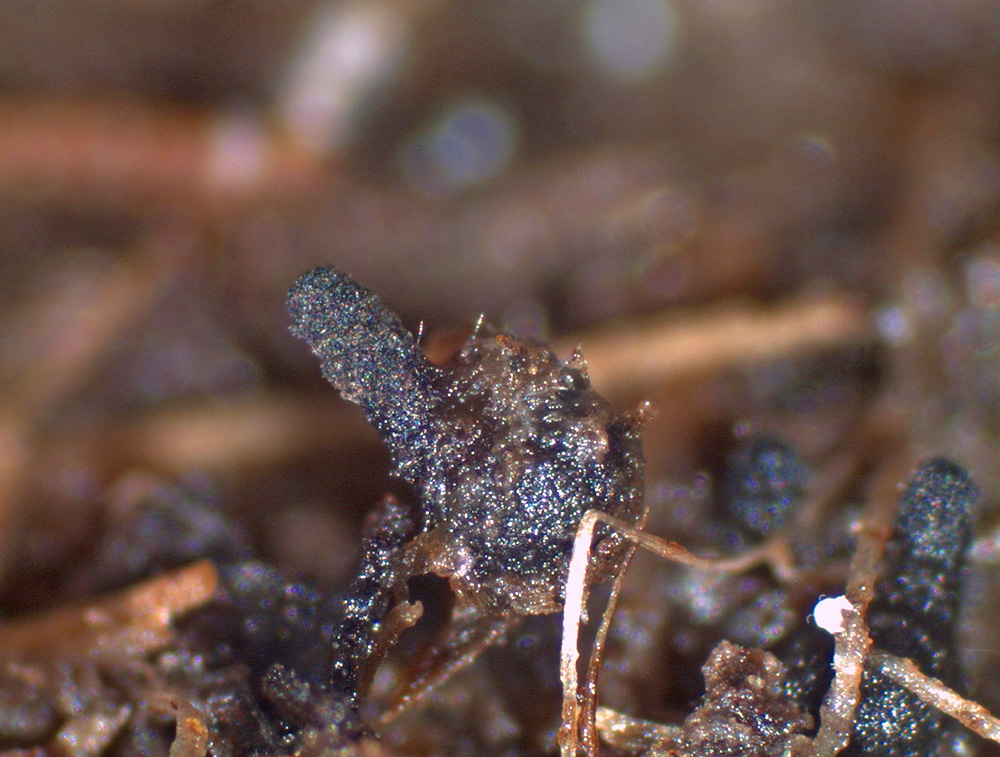 Um das Ostiolum herum sind mehr oder weniger dicke, kurze septierte Haare, das Pseudothecium selber wiederum ist reichlich mit ca 2-3 µm breiten, grauen Haaren besetzt.
