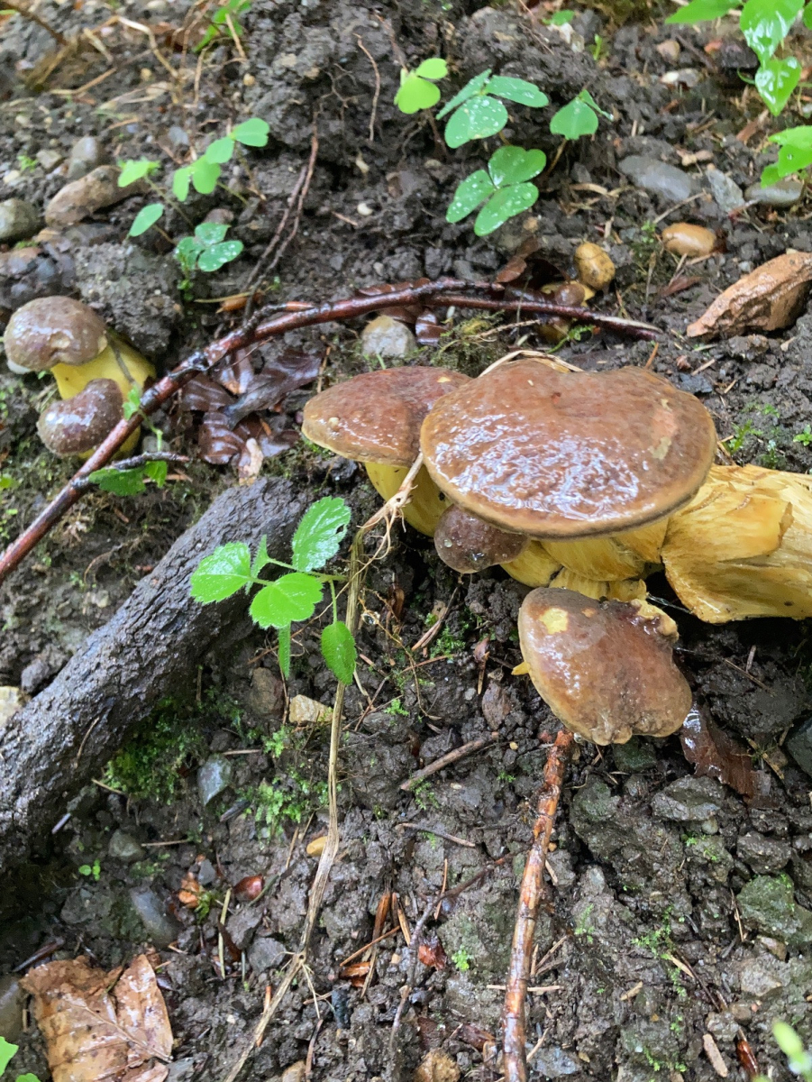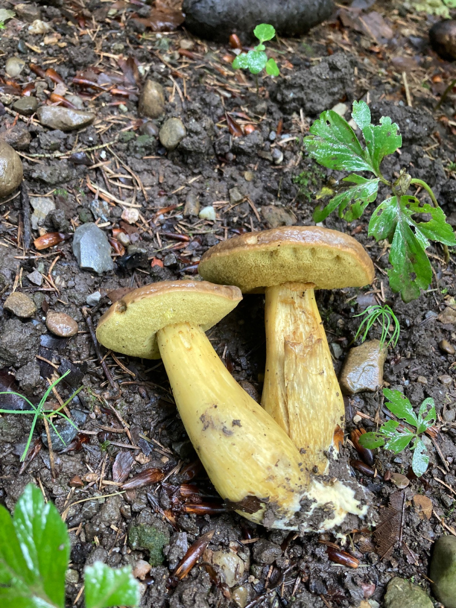 • Diese Glücklichen kamen als einzige in den Genuss eines frühmorgentlichen zweiminütigen lokalen Gusses welcher nach fünf Minuten komplett verdunstet war. Vermute hier Xerocomus. Da Habitat am Bord eines reinen dichten Fichtenbestandes, tendiere ich auf Xerocomus ferrugineus? Speziell, wie die FK ineinander verwachsen sind: